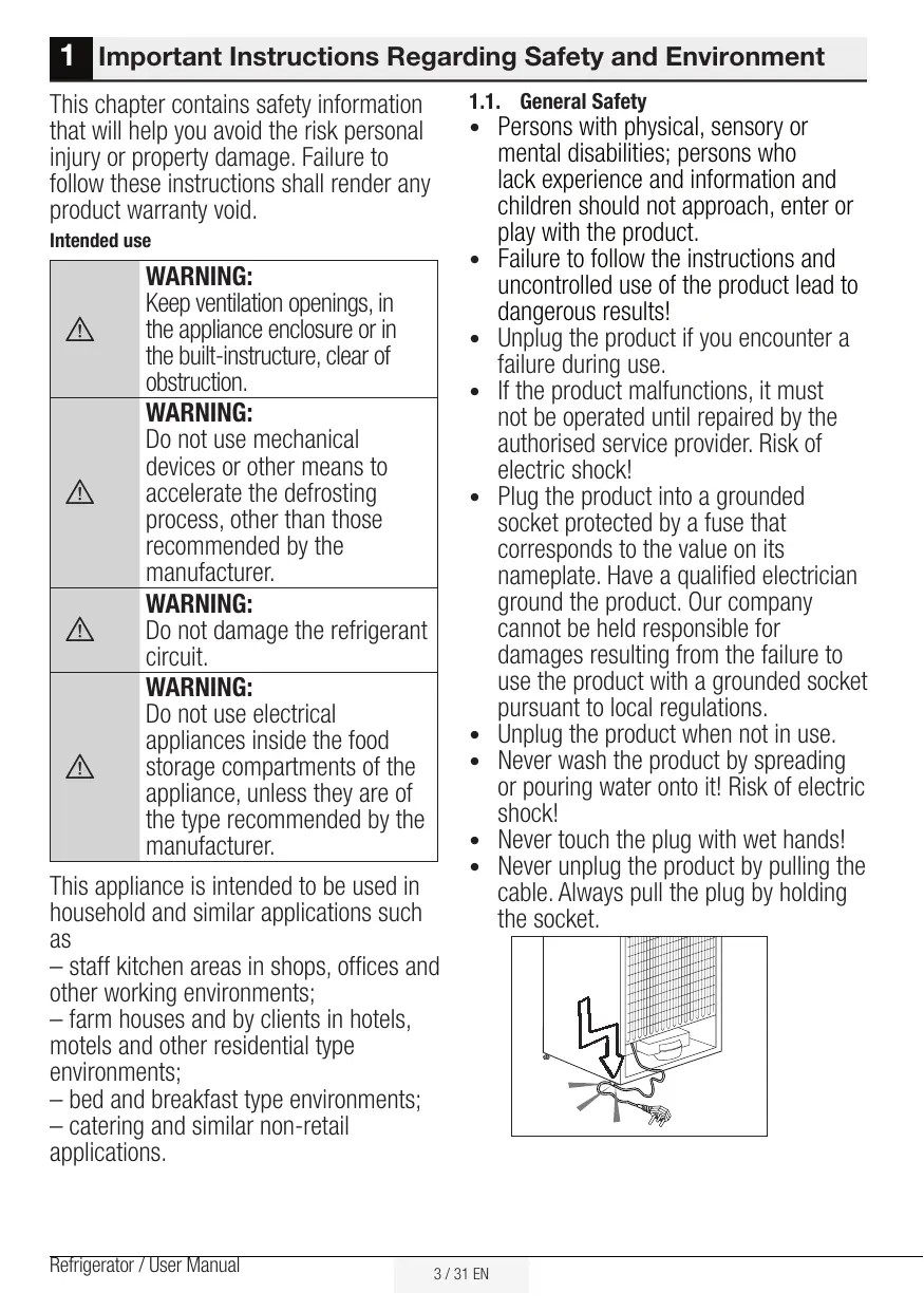 Risk of injury and damage to property. Risk of electric shock. Packaging materials of the product are manufactured from recyclable materials in accordance with our National Environment Regulations. Contents 1 Important Instructions Regarding Safety and Environment 1.1. General Safety...3