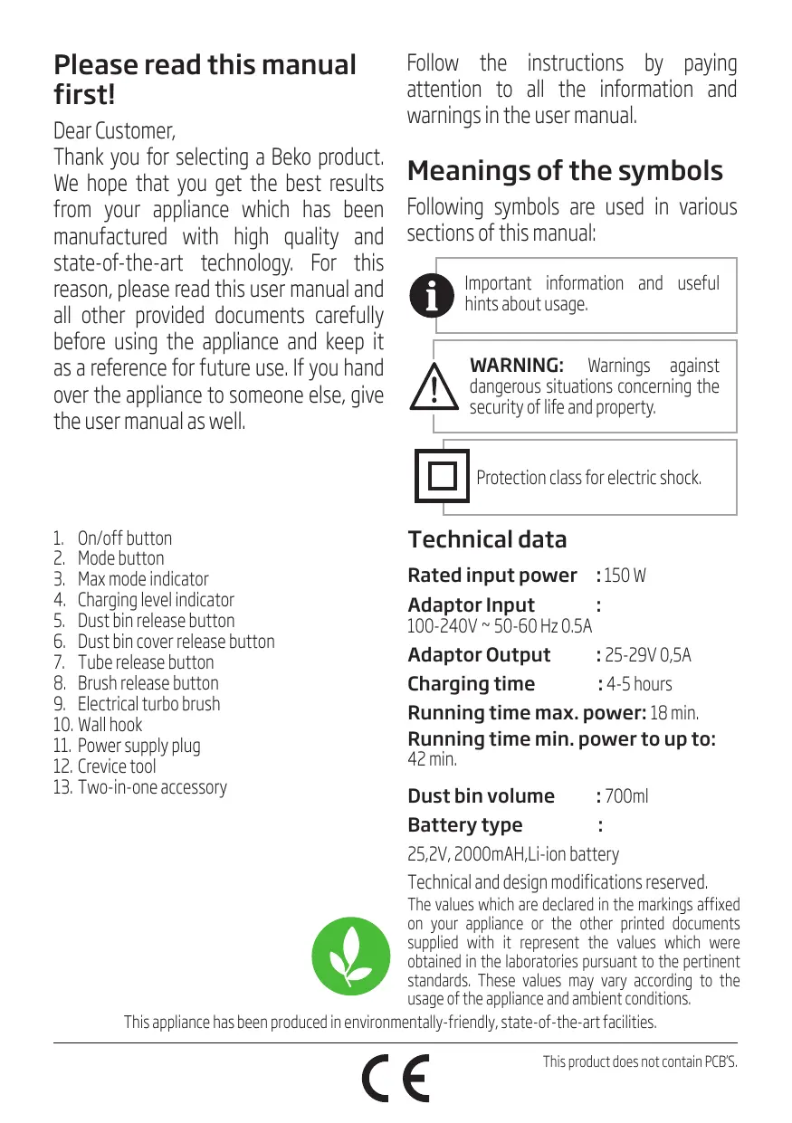 Thank you for selecting a Beko product. We hope that you get the best results Meanings of the symbols from your appliance which has been Following symbols are used in various manufactured with high quality and sections of this manual: state-of-the-art technology. For this Important information and useful reason, please read this user manual and hints about usage. all other provided documents carefully before using the appliance and keep it WARNING: Warnings against as a reference for future use. If you hand dangerous situations concerning the over the appliance to someone else, give security of life and property. the user manual as well. Protection class for electric shock. 1. On/off button 2. Mode button 3. Max mode indicator 4. Charging level indicator 5. Dust bin release button 6. Dust bin cover release button 7. Tube release button 8. Brush release button 9. Electrical turbo brush 10. Wall hook 11. Power supply plug 12. Crevice tool 13. Two-in-one accessory