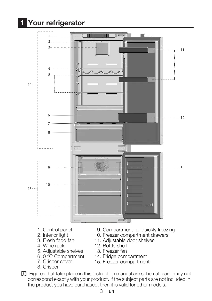 1. Control panel 9. Compartment for quickly freezing 2. Interior light 10. Freezer compartment drawers 3. Fresh food fan 11. Adjustable door shelves 4. Wine rack 12. Bottle shelf 5. Adjustable shelves 13. Freezer fan 6. 0 °C Compartment 14. Fridge compartment 7. Crisper cover 15. Freezer compartment 8. Crisper C Figures that take place in this instruction manual are schematic and may not correspond exactly with your product. If the subject parts are not included in the product you have purchased, then it is valid for other models. 3 EN