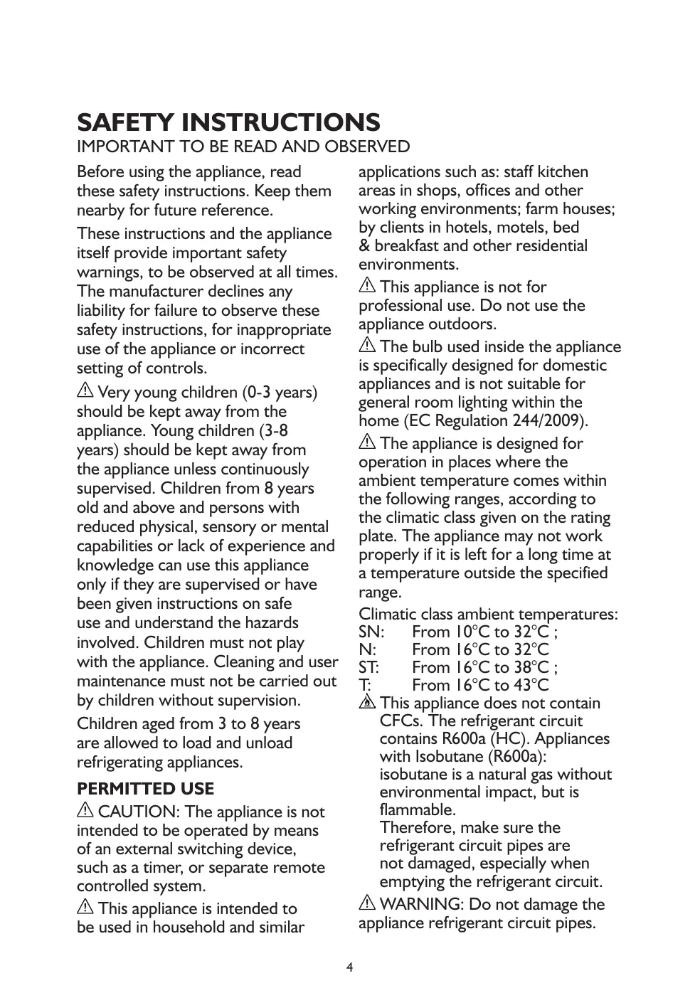 These instructions and the appliance by clients in hotels, motels, bed & breakfast and other residential itself provide important safety warnings, to be observed at all times. environments. This appliance is not for The manufacturer declines any professional use. Do not use the liability for failure to observe these appliance outdoors. safety instructions, for inappropriate The bulb used inside the appliance use of the appliance or incorrect is specifically designed for domestic setting of controls. appliances and is not suitable for Very young children (0-3 years) general room lighting within the should be kept away from the home (EC Regulation 244/2009). appliance. Young children (3-8 The appliance is designed for years) should be kept away from operation in places where the the appliance unless continuously ambient temperature comes within supervised. Children from 8 years the following ranges, according to old and above and persons with the climatic class given on the rating reduced physical, sensory or mental plate. The appliance may not work capabilities or lack of experience and properly if it is left for a long time at knowledge can use this appliance a temperature outside the specified only if they are supervised or have range. been given instructions on safe Climatic class ambient temperatures: use and understand the hazards SN: From 10°C to 32°C ; involved. Children must not play N: From 16°C to 32°C with the appliance. Cleaning and user ST: From 16°C to 38°C ; maintenance must not be carried out T: From 16°C to 43°C by children without supervision. This appliance does not contain CFCs. The refrigerant circuit Children aged from 3 to 8 years contains R600a (HC). Appliances are allowed to load and unload with Isobutane (R600a): refrigerating appliances. isobutane is a natural gas without PERMITTED USE environmental impact, but is flammable. CAUTION: The appliance is not Therefore, make sure the intended to be operated by means refrigerant circuit pipes are of an external switching device, not damaged, especially when such as a timer, or separate remote emptying the refrigerant circuit. controlled system. WARNING: Do not damage the This appliance is intended to appliance refrigerant circuit pipes. be used in household and similar 4