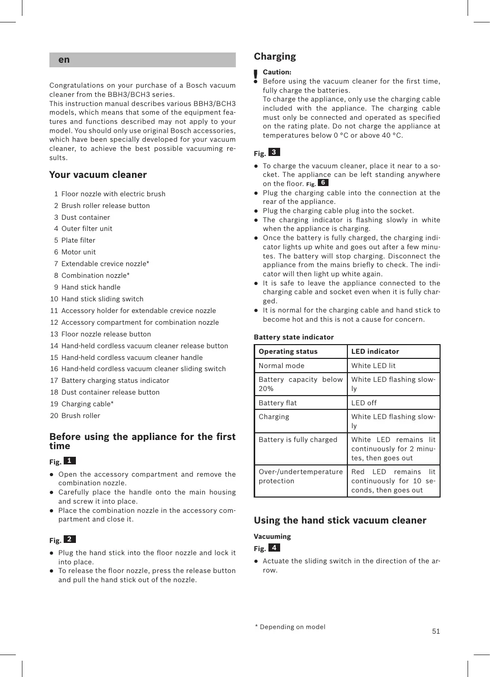 Congratulations on your purchase of a Bosch vacuum cleaner from the BBH3/BCH3 series. This instruction manual describes various BBH3/BCH3 models, which means that some of the equipment features and functions described may not apply to your model. You should only use original Bosch accessories, which have been specially developed for your vacuum cleaner, to achieve the best possible vacuuming results. Your vacuum cleaner 1 Floor nozzle with electric brush 2 Brush roller release button 3 Dust container 4 Outer filter unit 5 Plate filter Charging