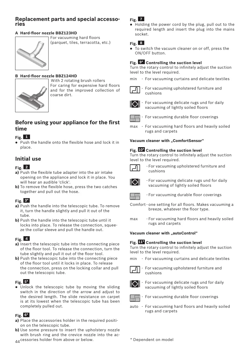 This instruction manual describes various GS70 models, which means that some of the equipment features and functions described may not apply to your model. You should only use original Bosch accessories, which have been specially developed for your vacuum cleaner, to achieve the best possible vacuuming results. Fold out the picture pages.