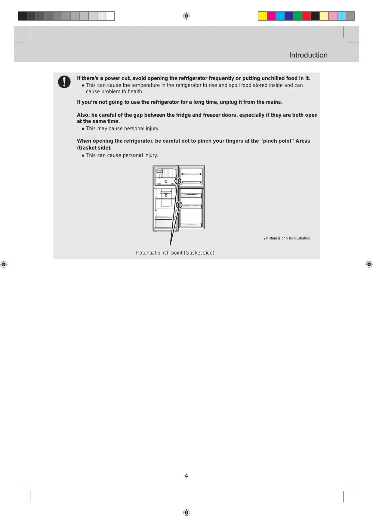If there’s a power cut, avoid opening the refrigerator frequently or putting unchilled food in it. Ɣ This can cause the temperature in the refrigerator to rise and spoil food stored inside and can cause problem to health. If you’re not going to use the refrigerator for a long time, unplug it from the mains. Also, be careful of the gap between the fridge and freezer doors, especially if they are both open at the same time. Ɣ This may cause personal injury. Areas (Gasket side). Ɣ This can cause personal injury.