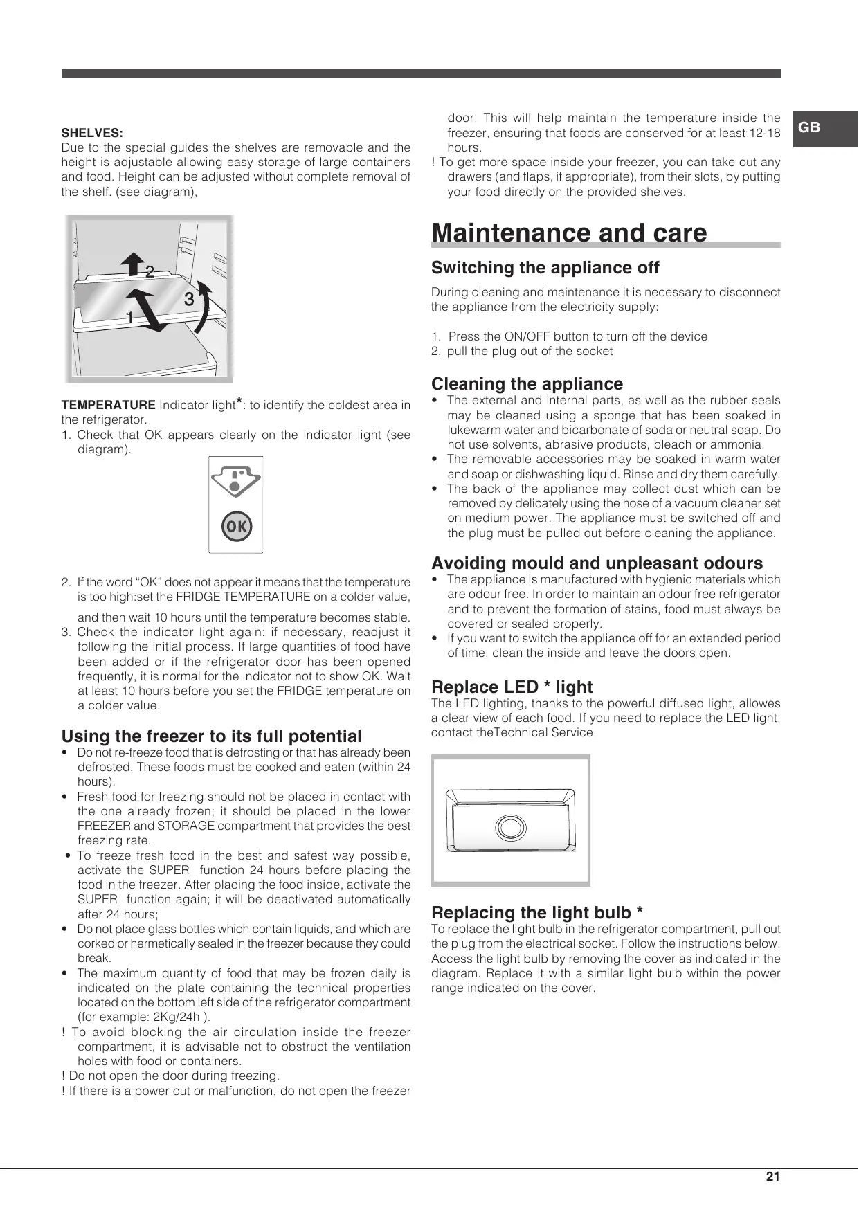 • The appliance is manufactured with hygienic materials which are odour free. In order to maintain an odour free refrigerator and to prevent the formation of stains, food must always be covered or sealed properly.
