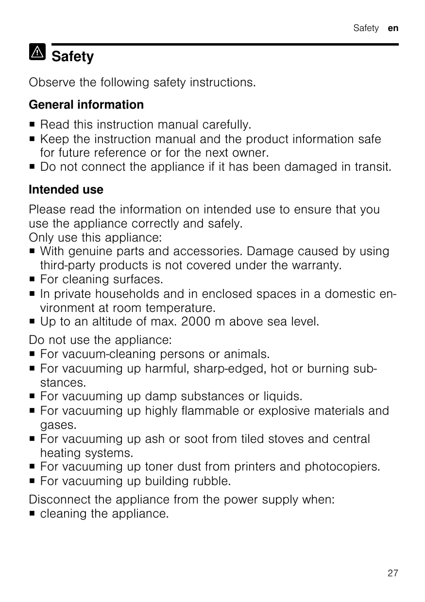Safety Observe the following safety instructions. General information ¡ Read this instruction manual carefully. ¡ Keep the instruction manual and the product information safe for future reference or for the next owner. ¡ Do not connect the appliance if it has been damaged in transit. Intended use Please read the information on intended use to ensure that you use the appliance correctly and safely. Only use this appliance: ¡ With genuine parts and accessories. Damage caused by using third-party products is not covered under the warranty. ¡ For cleaning surfaces. ¡ In private households and in enclosed spaces in a domestic environment at room temperature. ¡ Up to an altitude of max. 2000 m above sea level. Do not use the appliance: ¡ For vacuum-cleaning persons or animals. ¡ For vacuuming up harmful, sharp-edged, hot or burning substances. ¡ For vacuuming up damp substances or liquids. ¡ For vacuuming up highly flammable or explosive materials and gases. ¡ For vacuuming up ash or soot from tiled stoves and central heating systems. ¡ For vacuuming up toner dust from printers and photocopiers. ¡ For vacuuming up building rubble. Disconnect the appliance from the power supply when: ¡ cleaning the appliance.