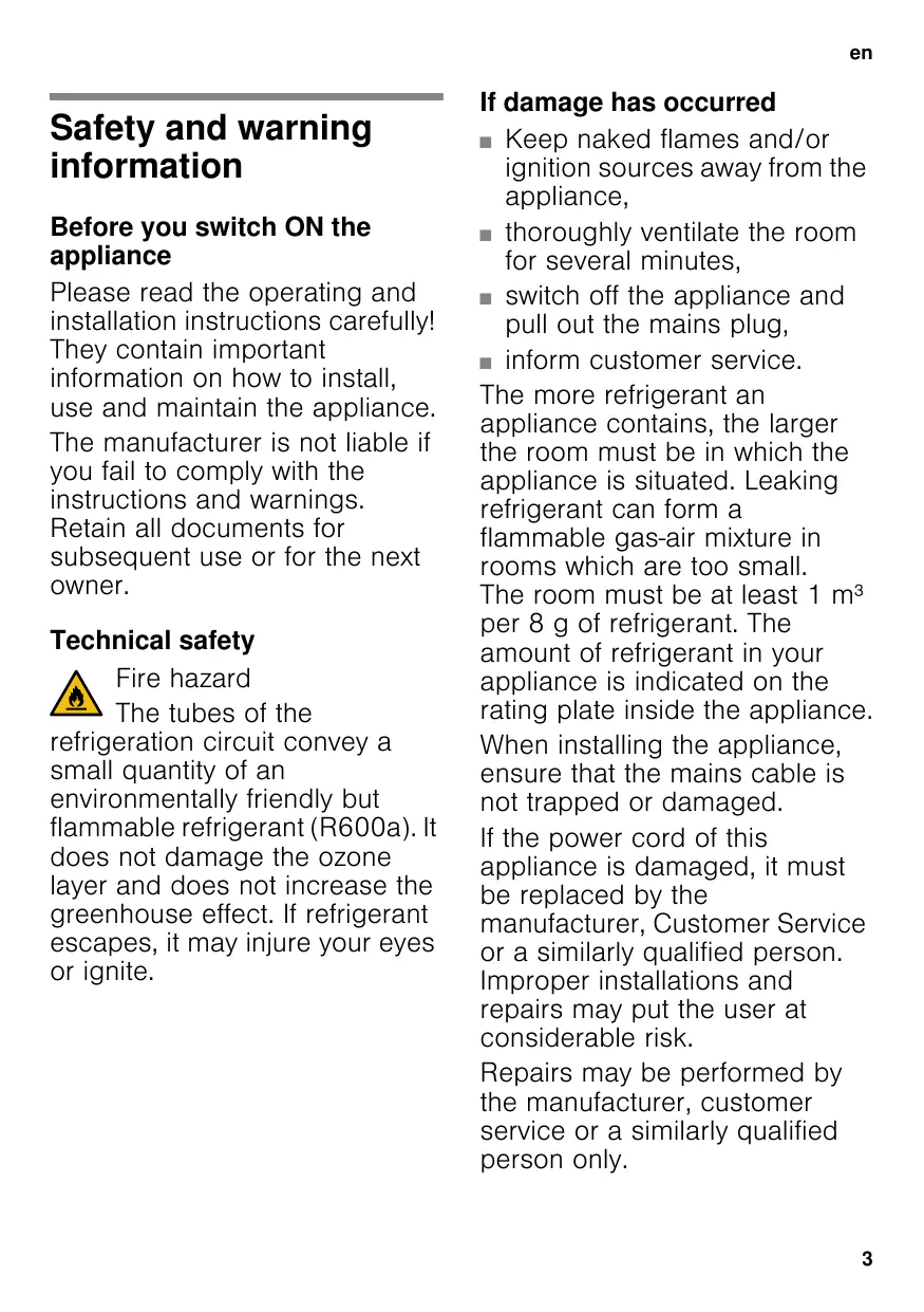 enTable of ContentsenI struction for Use Safety and warning information Before you switch ON the appliance Please read the operating and installation instructions carefully! They contain important information on how to install, use and maintain the appliance. The manufacturer is not liable if you fail to comply with the instructions and warnings. Retain all documents for subsequent use or for the next owner. Technical safety Fire hazard The tubes of the refrigeration circuit convey a small quantity of an environmentally friendly but flammable refrigerant (R600a). It does not damage the ozone layer and does not increase the greenhouse effect. If refrigerant escapes, it may injure your eyes or ignite. If damage has occurred ■ Keep naked flames and/or ignition sources away from the appliance, ■ thoroughly ventilate the room for several minutes, ■ switch off the appliance and pull out the mains plug, ■ inform customer service. The more refrigerant an appliance contains, the larger the room must be in which the appliance is situated. Leaking refrigerant can form a flammable gas-air mixture in rooms which are too small. The room must be at least 1 m³ per 8 g of refrigerant. The amount of refrigerant in your appliance is indicated on the rating plate inside the appliance. When installing the appliance, ensure that the mains cable is not trapped or damaged. If the power cord of this appliance is damaged, it must be replaced by the manufacturer, Customer Service or a similarly qualified person. Improper installations and repairs may put the user at considerable risk. Repairs may be performed by the manufacturer, customer service or a similarly qualified person only.
