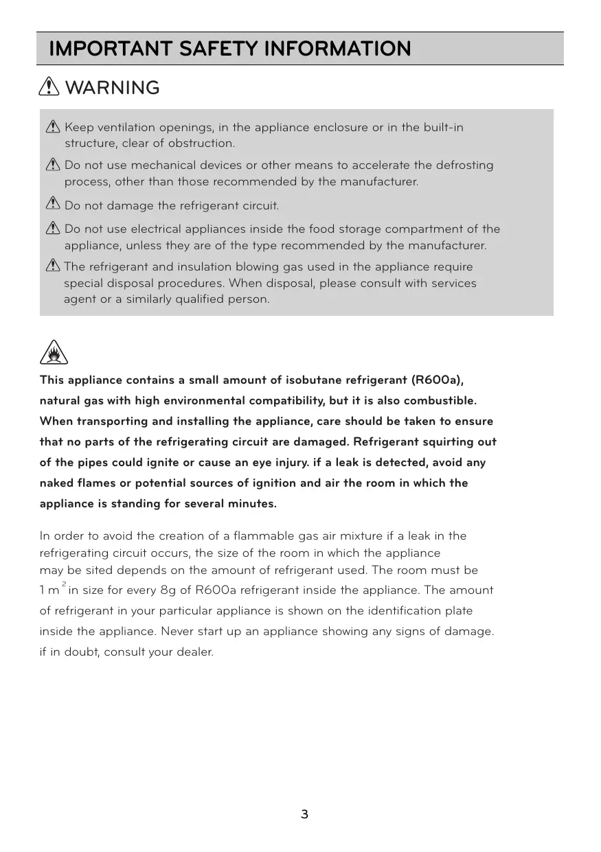 This appliance contains a small amount of isobutane refrigerant (R600a), natural gas with high environmental compatibility, but it is also combustible.