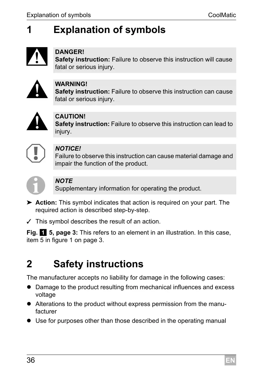 ✓ This symbol describes the result of an action. Fig. 1 5, page 3: This refers to an element in an illustration. In this case, item 5 in figure 1 on page 3.
