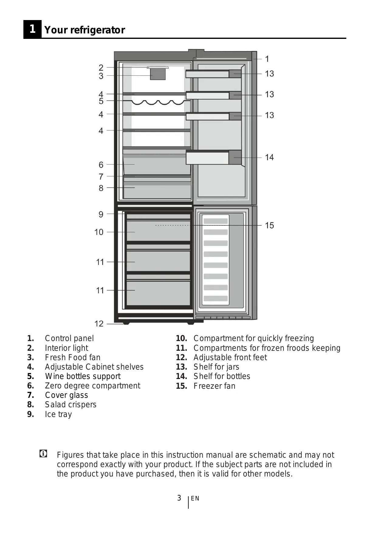 Compartment for quickly freezing Compartments for frozen froods keeping Adjustable front feet Shelf for jars Shelf for bottles Freezer fan Figures that take place in this instruction manual are schematic and may not correspond exactly with your product. If the subject parts are not included in the product you have purchased, then it is valid for other models.