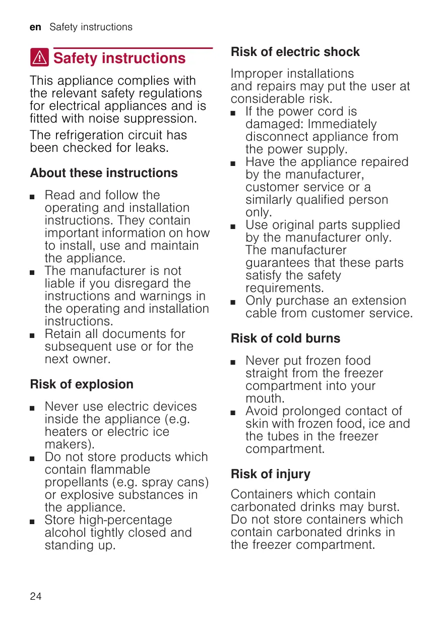 Risk of electric shock Improper installations and repairs may put the user at considerable risk. ■ If the power cord is damaged: Immediately disconnect appliance from the power supply. ■ Have the appliance repaired by the manufacturer, customer service or a similarly qualified person only. ■ Use original parts supplied by the manufacturer only. The manufacturer guarantees that these parts satisfy the safety requirements. ■ Only purchase an extension cable from customer service. Risk of cold burns ■
