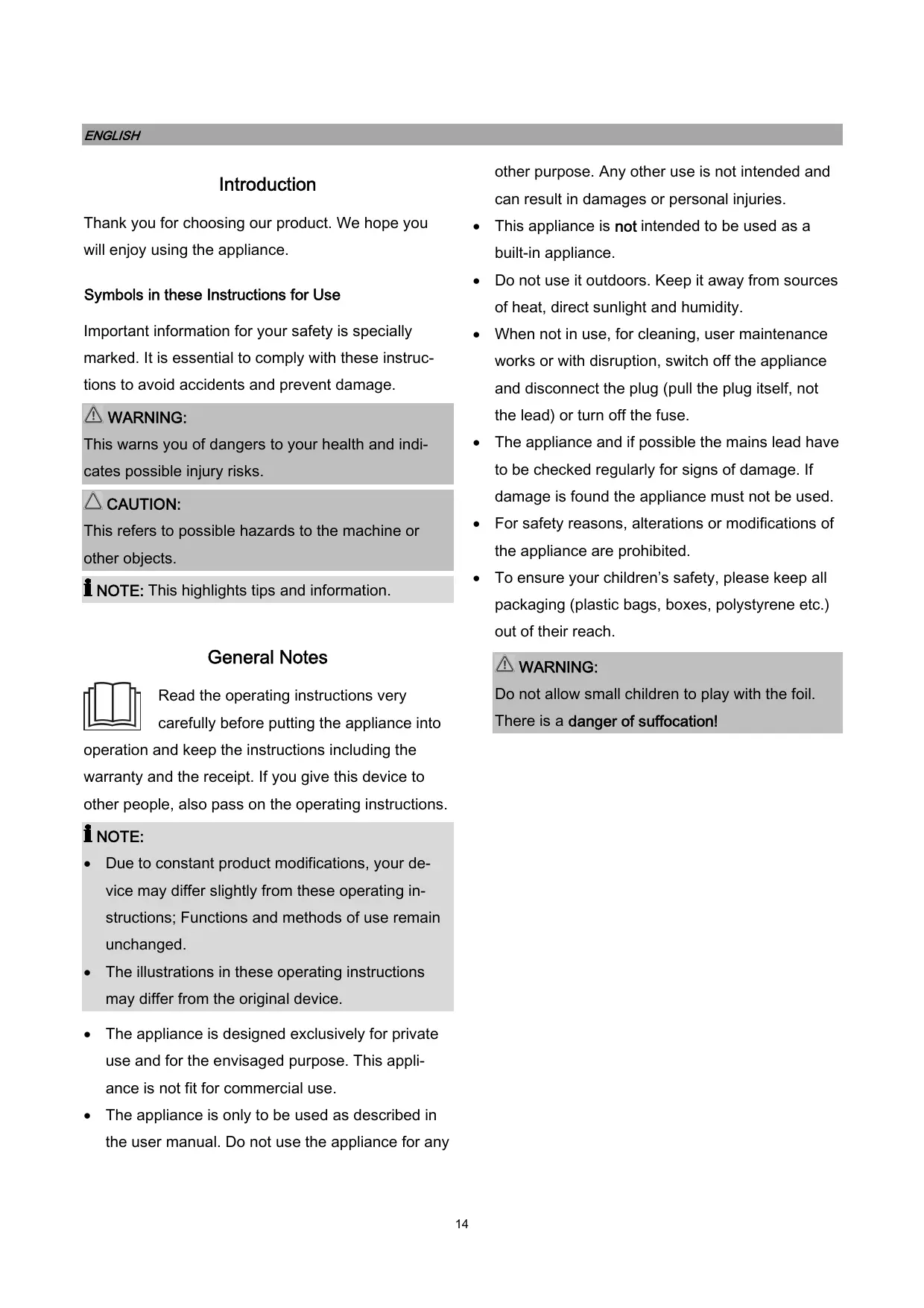 Read the operating instructions very Do not allow small children to play with the foil. carefully before putting the appliance into There is a danger of suffocation! operation and keep the instructions including the warranty and the receipt. If you give this device to other people, also pass on the operating instructions. NOTE: Due to constant product modifications, your device may differ slightly from these operating instructions; Functions and methods of use remain unchanged. The illustrations in these operating instructions may differ from the original device. The appliance is designed exclusively for private use and for the envisaged purpose. This appliance is not fit for commercial use. The appliance is only to be used as described in the user manual. Do not use the appliance for any