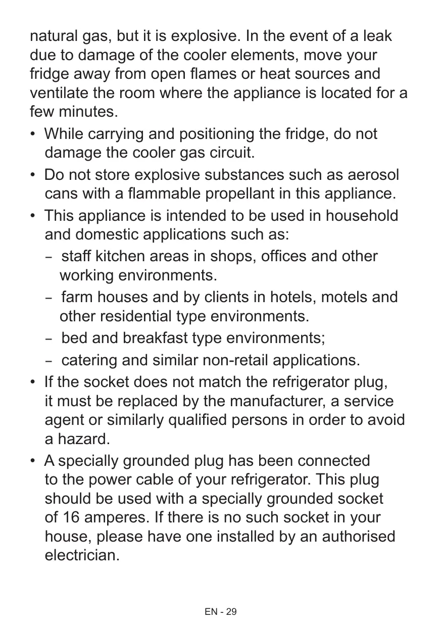 natural gas, but it is explosive. In the event of a leak due to damage of the cooler elements, move your fridge away from open flames or heat sources and ventilate the room where the appliance is located for a few minutes.