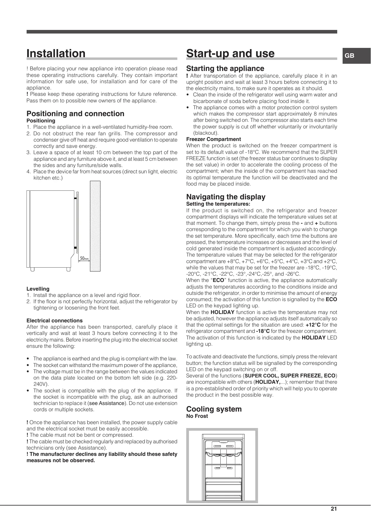 GB The No Frost system circulates cold air continuously to collect humidity and prevent ice and frost formation. The system maintains an optimal humidity level in the compartment, preserving the original quality of the food, preventing the food from sticking together and making defrosting a thing of the past. Do not block the aeration cells by placing food or containers in direct contact with the refrigerating back panel. Close bottles and wrap food tightly.