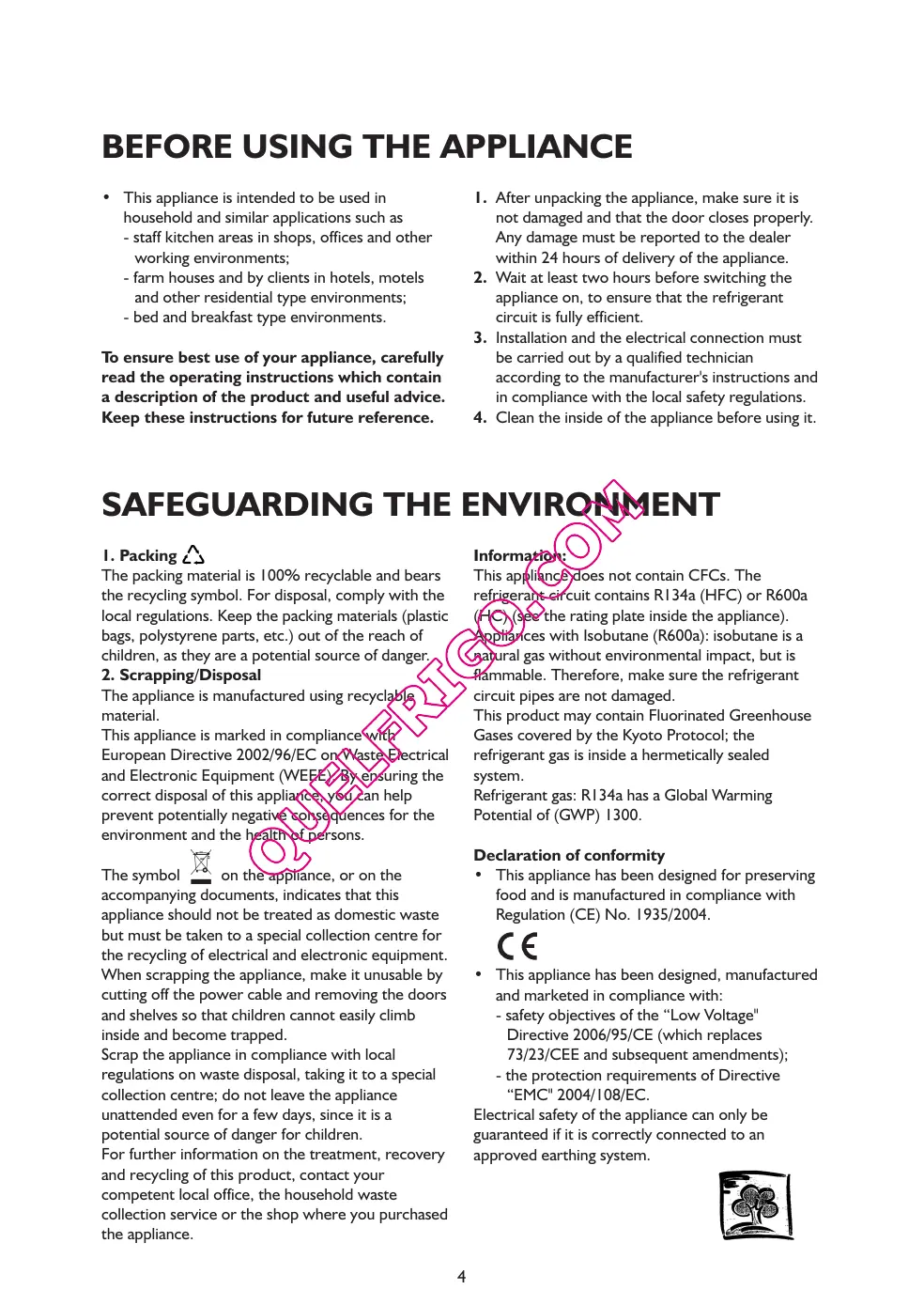The appliance is manufactured using recyclable material. This appliance is marked in compliance with European Directive 2002/96/EC on Waste Electrical and Electronic Equipment (WEEE). By ensuring the correct disposal of this appliance, you can help prevent potentially negative consequences for the environment and the health of persons. Information: This appliance does not contain CFCs. The refrigerant circuit contains R134a (HFC) or R600a (HC) (see the rating plate inside the appliance). Appliances with Isobutane (R600a): isobutane is a natural gas without environmental impact, but is flammable. Therefore, make sure the refrigerant circuit pipes are not damaged. This product may contain Fluorinated Greenhouse Gases covered by the Kyoto Protocol; the refrigerant gas is inside a hermetically sealed system. Refrigerant gas: R134a has a Global Warming Potential of (GWP) 1300. Declaration of conformity