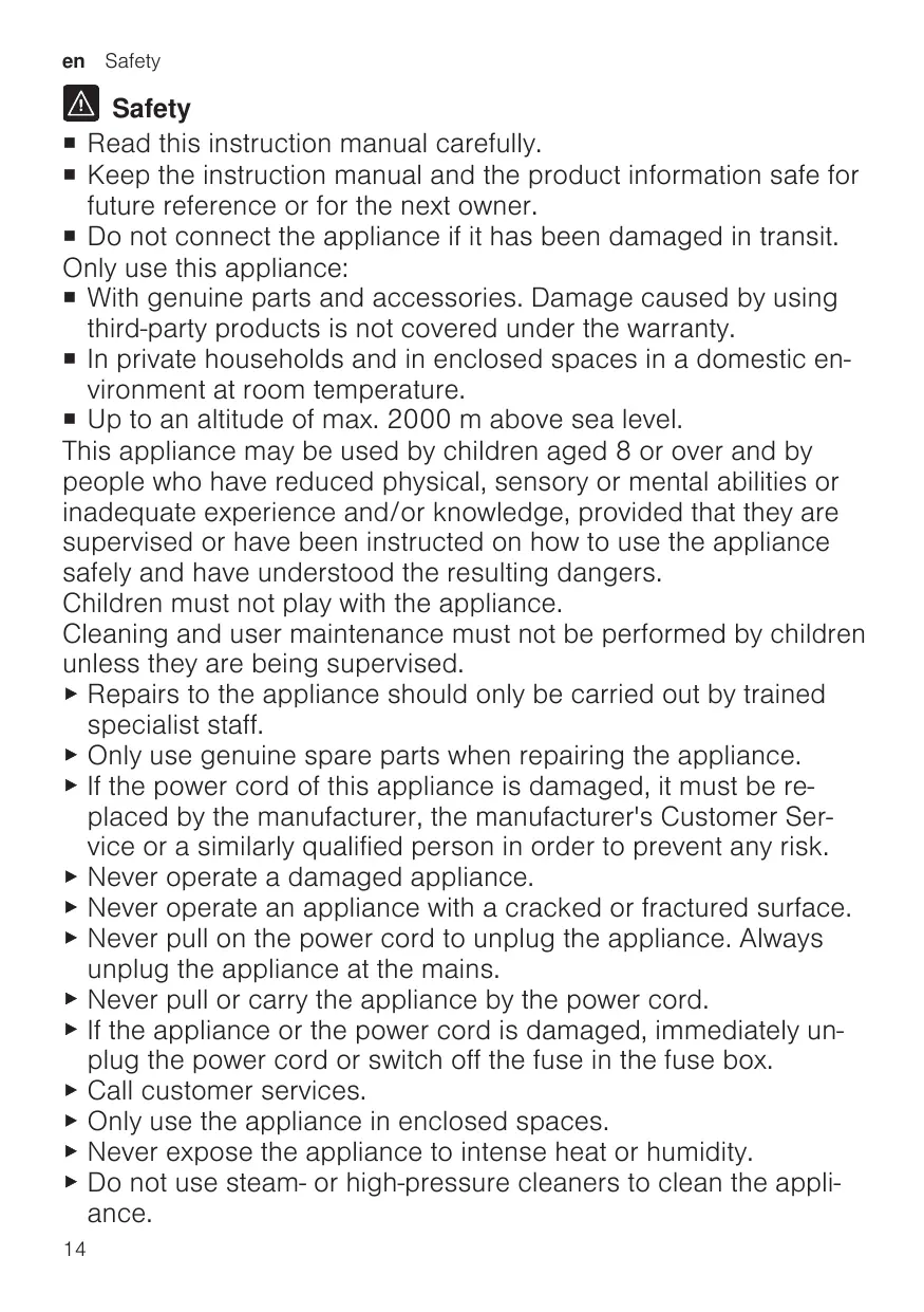 This appliance may be used by children aged 8 or over and by people who have reduced physical, sensory or mental abilities or inadequate experience and/or knowledge, provided that they are supervised or have been instructed on how to use the appliance safely and have understood the resulting dangers.