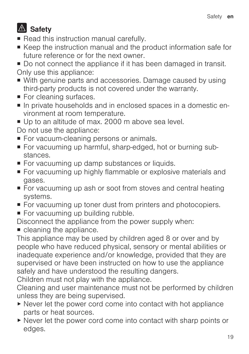 ¡ Read this instruction manual carefully. ¡ Keep the instruction manual and the product information safe for future reference or for the next owner. ¡ Do not connect the appliance if it has been damaged in transit. Only use this appliance: ¡ With genuine parts and accessories. Damage caused by using third-party products is not covered under the warranty. ¡ For cleaning surfaces. ¡ In private households and in enclosed spaces in a domestic environment at room temperature. ¡ Up to an altitude of max. 2000 m above sea level. Do not use the appliance: ¡ For vacuum-cleaning persons or animals. ¡ For vacuuming up harmful, sharp-edged, hot or burning substances. ¡ For vacuuming up damp substances or liquids. ¡ For vacuuming up highly flammable or explosive materials and gases. ¡ For vacuuming up ash or soot from stoves and central heating systems. ¡ For vacuuming up toner dust from printers and photocopiers. ¡ For vacuuming up building rubble. Disconnect the appliance from the power supply when: ¡ cleaning the appliance. This appliance may be used by children aged 8 or over and by people who have reduced physical, sensory or mental abilities or inadequate experience and/or knowledge, provided that they are supervised or have been instructed on how to use the appliance safely and have understood the resulting dangers. Children must not play with the appliance. Cleaning and user maintenance must not be performed by children unless they are being supervised. ▶ Never let the power cord come into contact with hot appliance parts or heat sources. ▶ Never let the power cord come into contact with sharp points or edges. 19