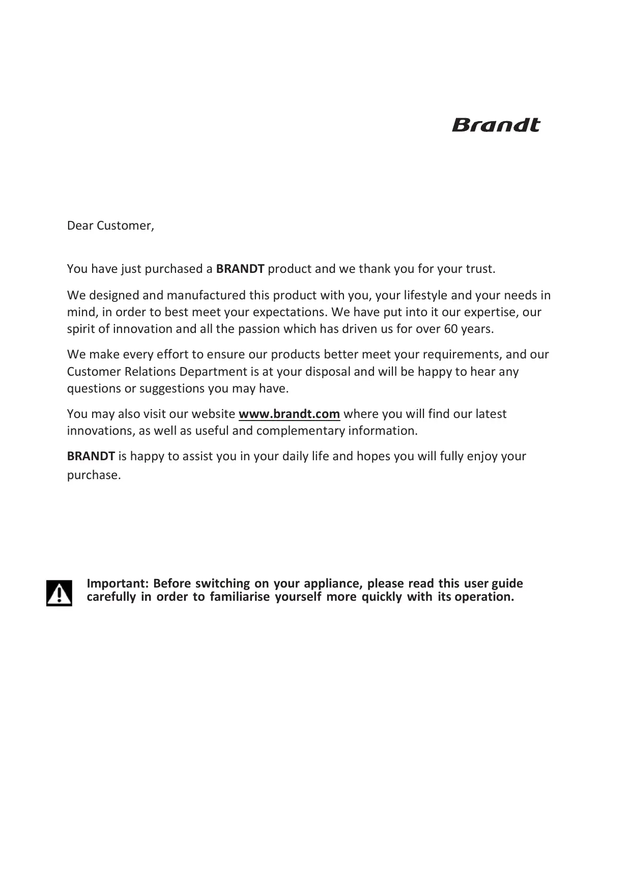 You have just purchased a BRANDT product and we thank you for your trust. We designed and manufactured this product with you, your lifestyle and your needs in mind, in order to best meet your expectations. We have put into it our expertise, our spirit of innovation and all the passion which has driven us for over 60 years. We make every effort to ensure our products better meet your requirements, and our Customer Relations Department is at your disposal and will be happy to hear any questions or suggestions you may have. You may also visit our website www.brandt.com where you will find our latest innovations, as well as useful and complementary information. BRANDT is happy to assist you in your daily life and hopes you will fully enjoy your purchase.