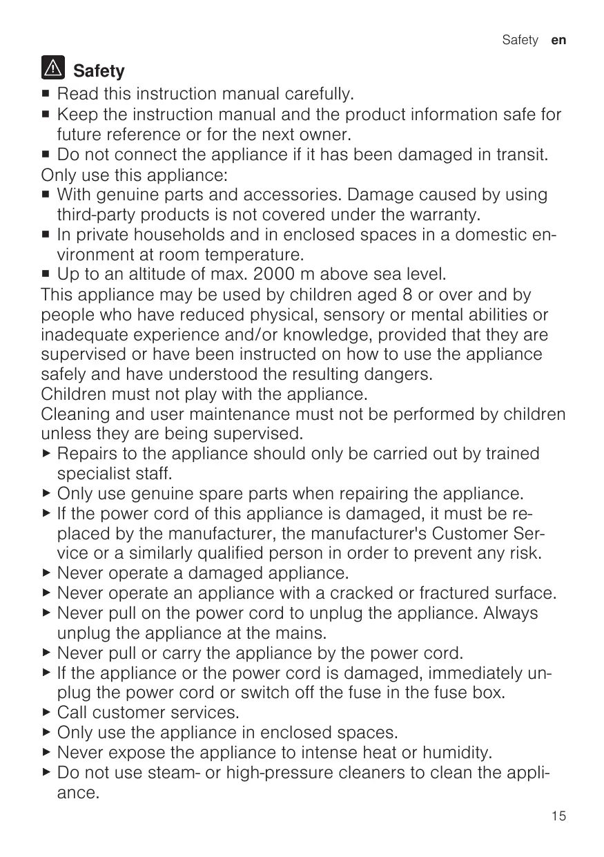 ¡ Read this instruction manual carefully. ¡ Keep the instruction manual and the product information safe for future reference or for the next owner. ¡ Do not connect the appliance if it has been damaged in transit. Only use this appliance: ¡ With genuine parts and accessories. Damage caused by using third-party products is not covered under the warranty. ¡ In private households and in enclosed spaces in a domestic environment at room temperature. ¡ Up to an altitude of max. 2000 m above sea level. This appliance may be used by children aged 8 or over and by people who have reduced physical, sensory or mental abilities or inadequate experience and/or knowledge, provided that they are supervised or have been instructed on how to use the appliance safely and have understood the resulting dangers. Children must not play with the appliance. Cleaning and user maintenance must not be performed by children unless they are being supervised. ▶ Repairs to the appliance should only be carried out by trained specialist staff. ▶ Only use genuine spare parts when repairing the appliance. ▶ If the power cord of this appliance is damaged, it must be replaced by the manufacturer, the manufacturer's Customer Service or a similarly qualified person in order to prevent any risk. ▶ Never operate a damaged appliance. ▶ Never operate an appliance with a cracked or fractured surface. ▶ Never pull on the power cord to unplug the appliance. Always unplug the appliance at the mains. ▶ Never pull or carry the appliance by the power cord. ▶ If the appliance or the power cord is damaged, immediately unplug the power cord or switch off the fuse in the fuse box. ▶ Call customer services. ▶ Only use the appliance in enclosed spaces. ▶ Never expose the appliance to intense heat or humidity. ▶ Do not use steam- or high-pressure cleaners to clean the appliance. 15