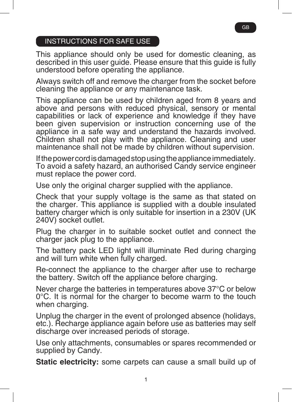 This appliance should only be used for domestic cleaning, as described in this user guide. Please ensure that this guide is fully understood before operating the appliance. Always switch off and remove the charger from the socket before cleaning the appliance or any maintenance task. This appliance can be used by children aged from 8 years and above and persons with reduced physical, sensory or mental capabilities or lack of experience and knowledge if they have been given supervision or instruction concerning use of the appliance in a safe way and understand the hazards involved. Children shall not play with the appliance. Cleaning and user maintenance shall not be made by children without supervision. If the power cord is damaged stop using the appliance immediately. To avoid a safety hazard, an authorised Candy service engineer must replace the power cord. Use only the original charger supplied with the appliance. Check that your supply voltage is the same as that stated on the charger. This appliance is supplied with a double insulated battery charger which is only suitable for insertion in a 230V (UK 240V) socket outlet. Plug the charger in to suitable socket outlet and connect the charger jack plug to the appliance. The battery pack LED light will illuminate Red during charging and will turn white when fully charged. Re-connect the appliance to the charger after use to recharge the battery. Switch off the appliance before charging. Never charge the batteries in temperatures above 37°C or below 0°C. It is normal for the charger to become warm to the touch when charging. Unplug the charger in the event of prolonged absence (holidays, etc.). Recharge appliance again before use as batteries may self discharge over increased periods of storage. Use only attachments, consumables or spares recommended or supplied by Candy. Static electricity: some carpets can cause a small build up of