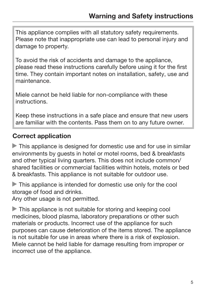 Warning and Safety instructions This appliance complies with all statutory safety requirements. Please note that inappropriate use can lead to personal injury and damage to property. To avoid the risk of accidents and damage to the appliance, please read these instructions carefully before using it for the first time. They contain important notes on installation, safety, use and maintenance. Miele cannot be held liable for non-compliance with these instructions. Keep these instructions in a safe place and ensure that new users are familiar with the contents. Pass them on to any future owner. Correct application This appliance is designed for domestic use and for use in similar environments by guests in hotel or motel rooms, bed & breakfasts and other typical living quarters. This does not include common/ shared facilities or commercial facilities within hotels, motels or bed & breakfasts. This appliance is not suitable for outdoor use. This appliance is intended for domestic use only for the cool storage of food and drinks. Any other usage is not permitted. This appliance is not suitable for storing and keeping cool medicines, blood plasma, laboratory preparations or other such materials or products. Incorrect use of the appliance for such purposes can cause deterioration of the items stored. The appliance is not suitable for use in areas where there is a risk of explosion. Miele cannot be held liable for damage resulting from improper or incorrect use of the appliance.