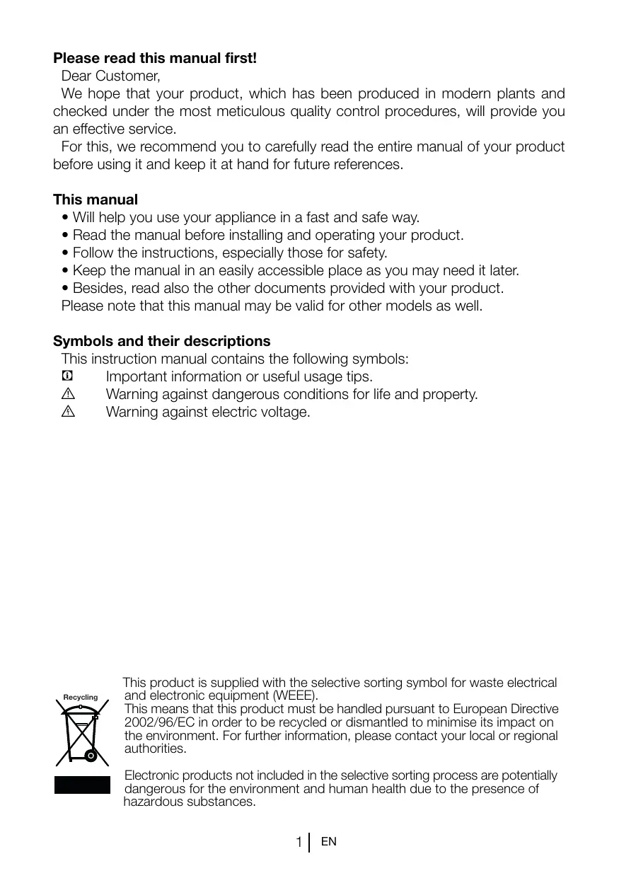 Please read this manual first! Dear Customer, We hope that your product, which has been produced in modern plants and checked under the most meticulous quality control procedures, will provide you an effective service. For this, we recommend you to carefully read the entire manual of your product before using it and keep it at hand for future references. This manual • Will help you use your appliance in a fast and safe way. • Read the manual before installing and operating your product. • Follow the instructions, especially those for safety. • Keep the manual in an easily accessible place as you may need it later. • Besides, read also the other documents provided with your product. Please note that this manual may be valid for other models as well. Symbols and their descriptions This instruction manual contains the following symbols: Important information or useful usage tips. C A Warning against dangerous conditions for life and property. B Warning against electric voltage.