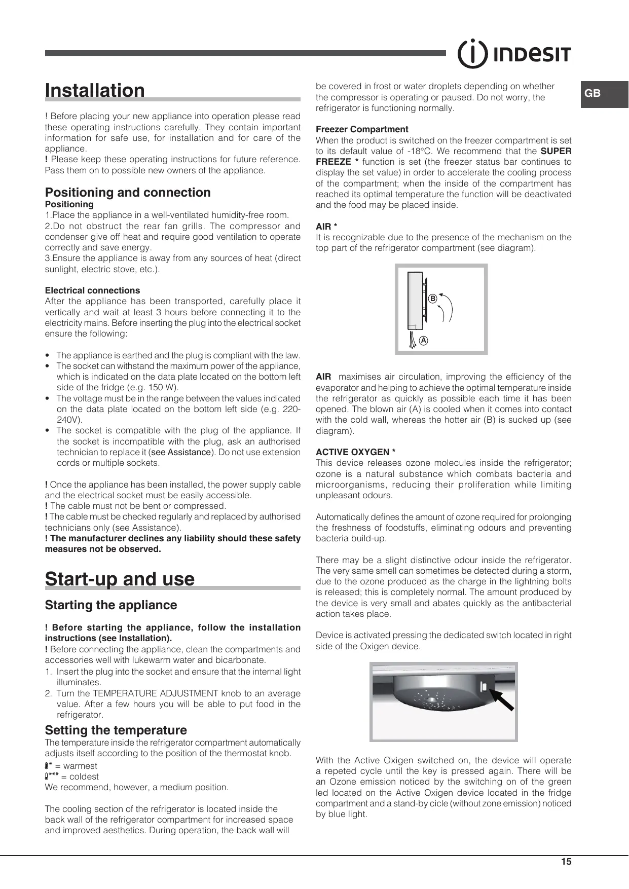 With the Active Oxigen switched on, the device will operate a repeted cycle until the key is pressed again. There will be an Ozone emission noticed by the switching on of the green led located on the Active Oxigen device located in the fridge compartment and a stand-by cicle (without zone emission) noticed by blue light.
