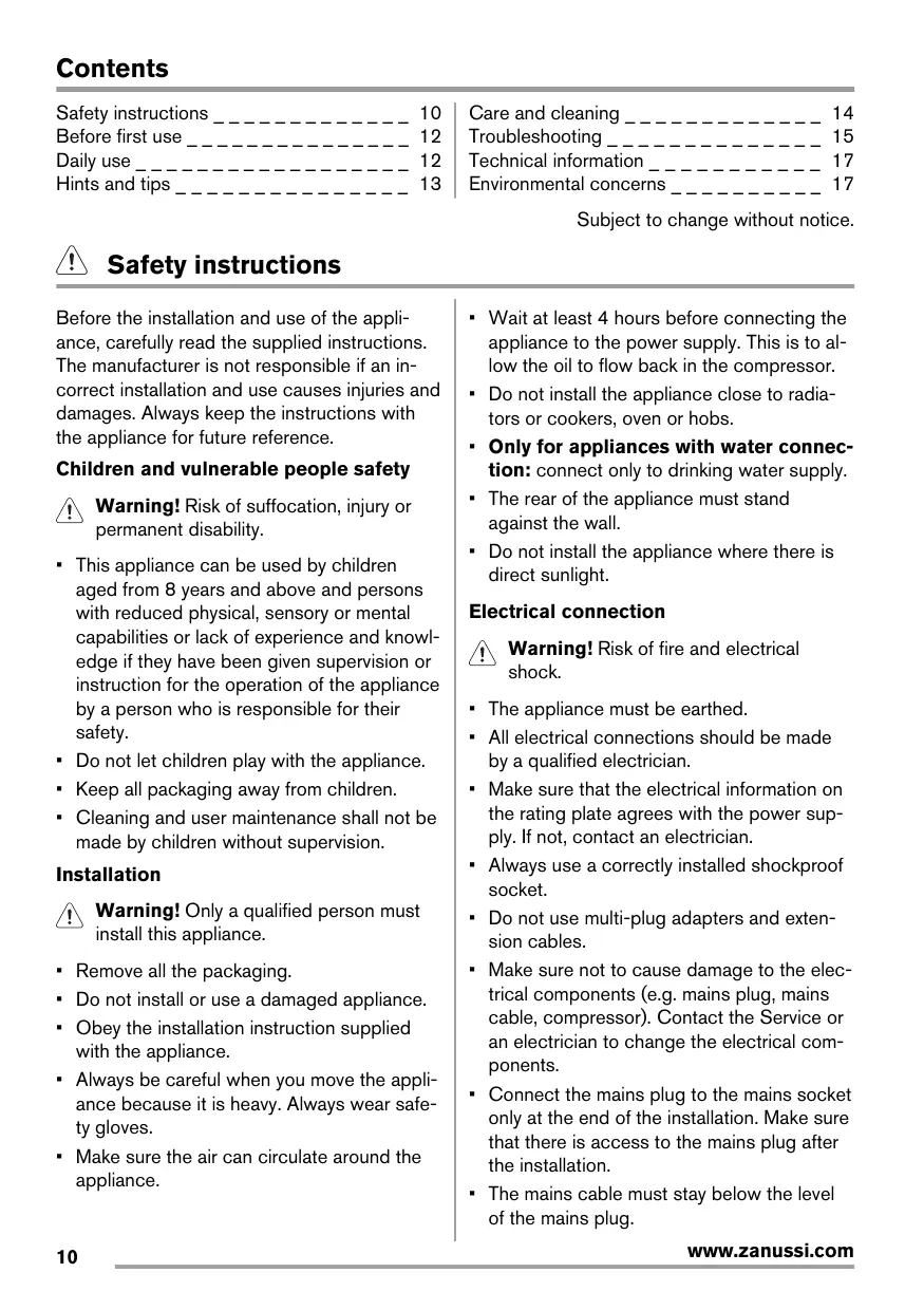 • Soyez toujours vigilants lorsque vous déplacez l'appareil car il est lourd. Portez toujours des gants de sécurité. • Assurez-vous que l'air circule autour de l'appareil. • Attendez au moins 4 heures avant de brancher l'appareil sur le secteur. Cela permet à l'huile de refouler dans le compresseur. • N'installez pas l'appareil à proximité d'un radiateur, d'une cuisinière, d'un four ou d'une table de cuisson. • Uniquement pour les appareils avec branchement d'eau : connectez l'appareil à une arrivée d'eau potable uniquement. • La surface arrière de l'appareil doit être positionnée contre un mur. • N'installez pas l'appareil dans un endroit exposé à la lumière directe du soleil. Branchement électrique Avertissement Risque d'incendie ou d'électrocution. • L'appareil doit être relié à la terre. • L'ensemble des branchements électriques doit être effectué par un technicien qualifié. • Vérifiez que les données électriques figurant sur la plaque signalétique correspondent à celles de votre réseau. Si ce n'est pas le cas, contactez un électricien. • Utilisez toujours une prise de courant de sécurité correctement installée. • L'appareil ne doit pas être raccordé à l'aide d'un prolongateur, d'une prise multiple ou www.zanussi.com