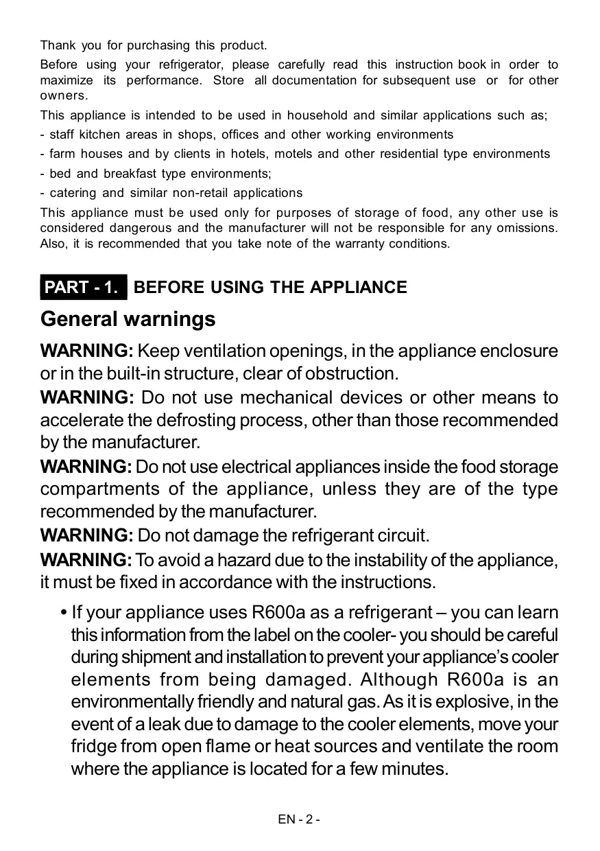 - If your appliance uses R600a as a refrigerant – you can learn this information from the label on the cooler- you should be careful during shipment and installation to prevent your appliance’s cooler elements from being damaged. Although R600a is an environmentally friendly and natural gas. As it is explosive, in the event of a leak due to damage to the cooler elements, move your fridge from open flame or heat sources and ventilate the room where the appliance is located for a few minutes. EN - 2 -