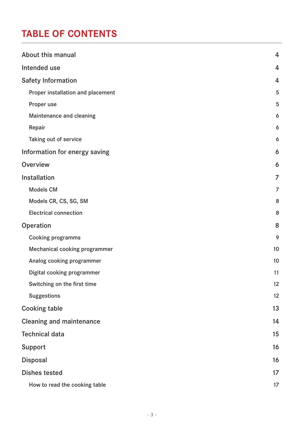 Note: The indications given in the table are the result of cooking tests carried out by a team of professional chefs. They are provided as a guide only, and can be changed according to personal tastes.