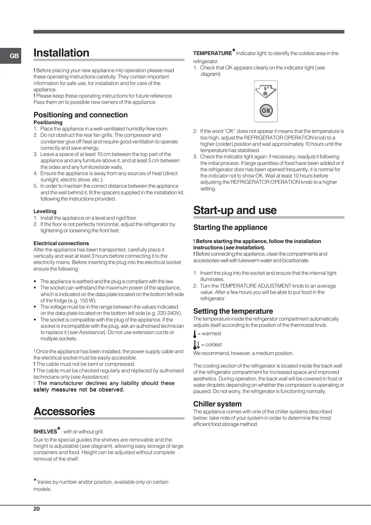 Start-up and use Starting the appliance ! Before starting the appliance, follow the installation instructions (see Installation). ! Before connecting the appliance, clean the compartments and accessories well with lukewarm water and bicarbonate. 1. Insert the plug into the socket and ensure that the internal light illuminates. 2. Turn the TEMPERATURE ADJUSTMENT knob to an average value. After a few hours you will be able to put food in the refrigerator.