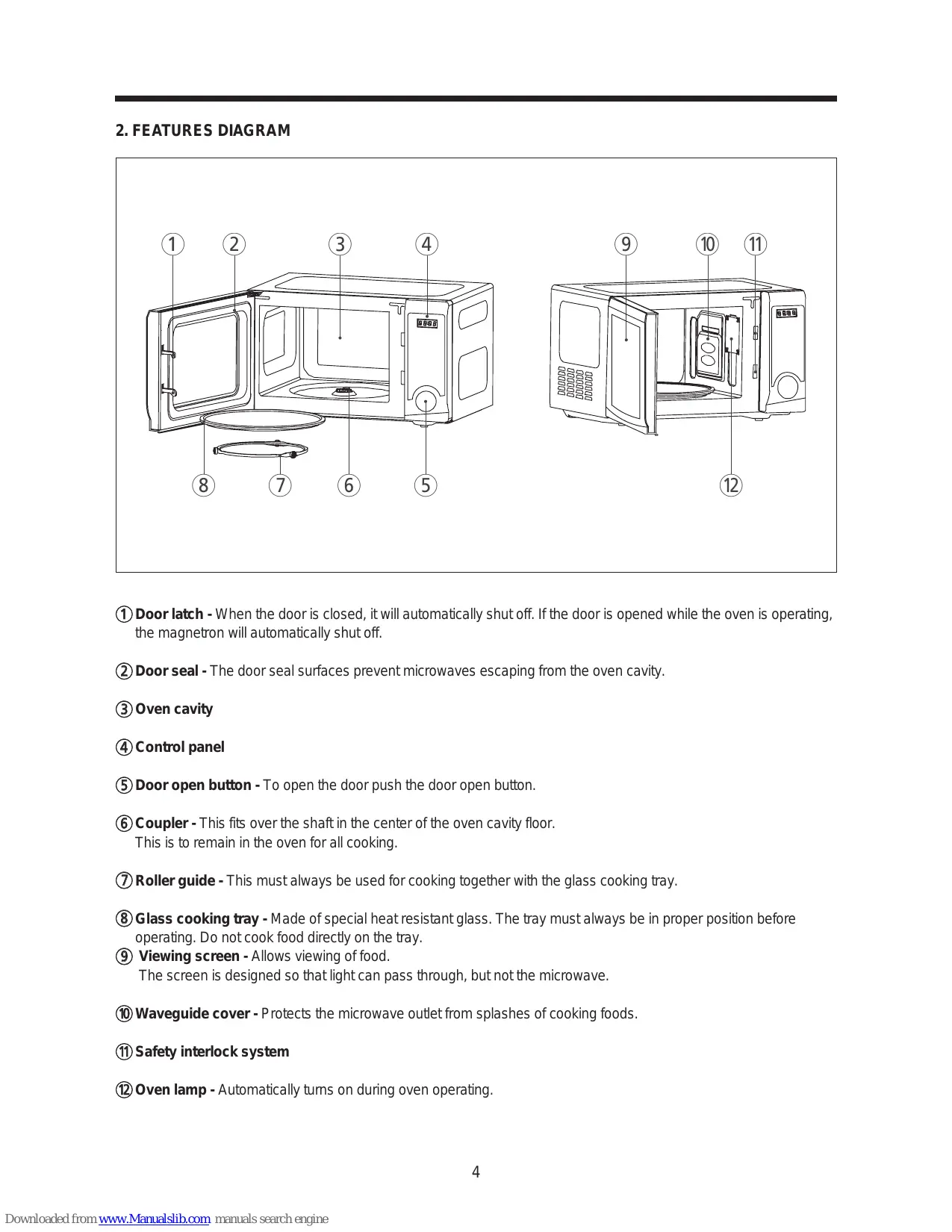 1 Door latch - When the door is closed, it will automatically shut off. If the door is opened while the oven is operating, the magnetron will automatically shut off. 2 Door seal - The door seal surfaces prevent microwaves escaping from the oven cavity. 3 Oven cavity 4 Control panel 5 Door open button - To open the door push the door open button. 6 Coupler - This fits over the shaft in the center of the oven cavity floor. This is to remain in the oven for all cooking. 7 Roller guide - This must always be used for cooking together with the glass cooking tray. 8 Glass cooking tray - Made of special heat resistant glass. The tray must always be in proper position before operating. Do not cook food directly on the tray. 9 Viewing screen - Allows viewing of food. The screen is designed so that light can pass through, but not the microwave. 0 Waveguide cover - Protects the microwave outlet from splashes of cooking foods. q Safety interlock system w Oven lamp - Automatically turns on during oven operating.
