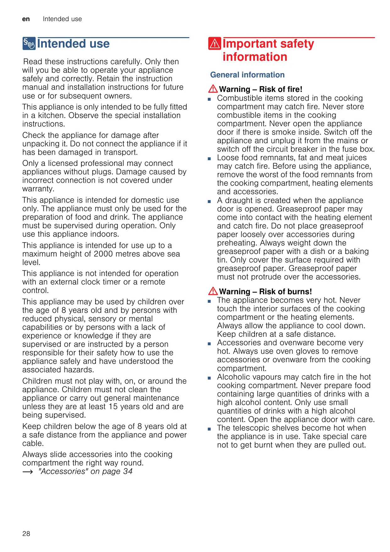 : Warning – Risk of burns! The appliance becomes very hot. Never touch the interior surfaces of the cooking compartment or the heating elements. Always allow the appliance to cool down. Keep children at a safe distance. Risk of serious burns! Accessories and ovenware become very hot. Always use oven gloves to remove accessories or ovenware from the cooking compartment. Risk of burns!vapours may catch fire in the hot Alcoholic cooking compartment. Never prepare food containing large quantities of drinks with a high alcohol content. Only use small quantities of drinks with a high alcohol content. Open the appliance door with care. Risk of burns! The telescopic shelves become hot when the appliance is in use. Take special care not to get burnt when they are pulled out.
