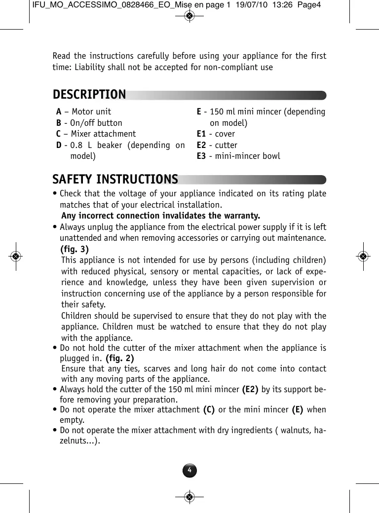 • Check that the voltage of your appliance indicated on its rating plate matches that of your electrical installation. Any incorrect connection invalidates the warranty. • Always unplug the appliance from the electrical power supply if it is left unattended and when removing accessories or carrying out maintenance. (fig. 3) This appliance is not intended for use by persons (including children) with reduced physical, sensory or mental capacities, or lack of experience and knowledge, unless they have been given supervision or instruction concerning use of the appliance by a person responsible for their safety. Children should be supervised to ensure that they do not play with the appliance. Children must be watched to ensure that they do not play with the appliance. • Do not hold the cutter of the mixer attachment when the appliance is plugged in. (fig. 2) Ensure that any ties, scarves and long hair do not come into contact with any moving parts of the appliance. • Always hold the cutter of the 150 ml mini mincer (E2) by its support before removing your preparation. • Do not operate the mixer attachment (C) or the mini mincer (E) when empty. • Do not operate the mixer attachment with dry ingredients ( walnuts, hazelnuts...). 4