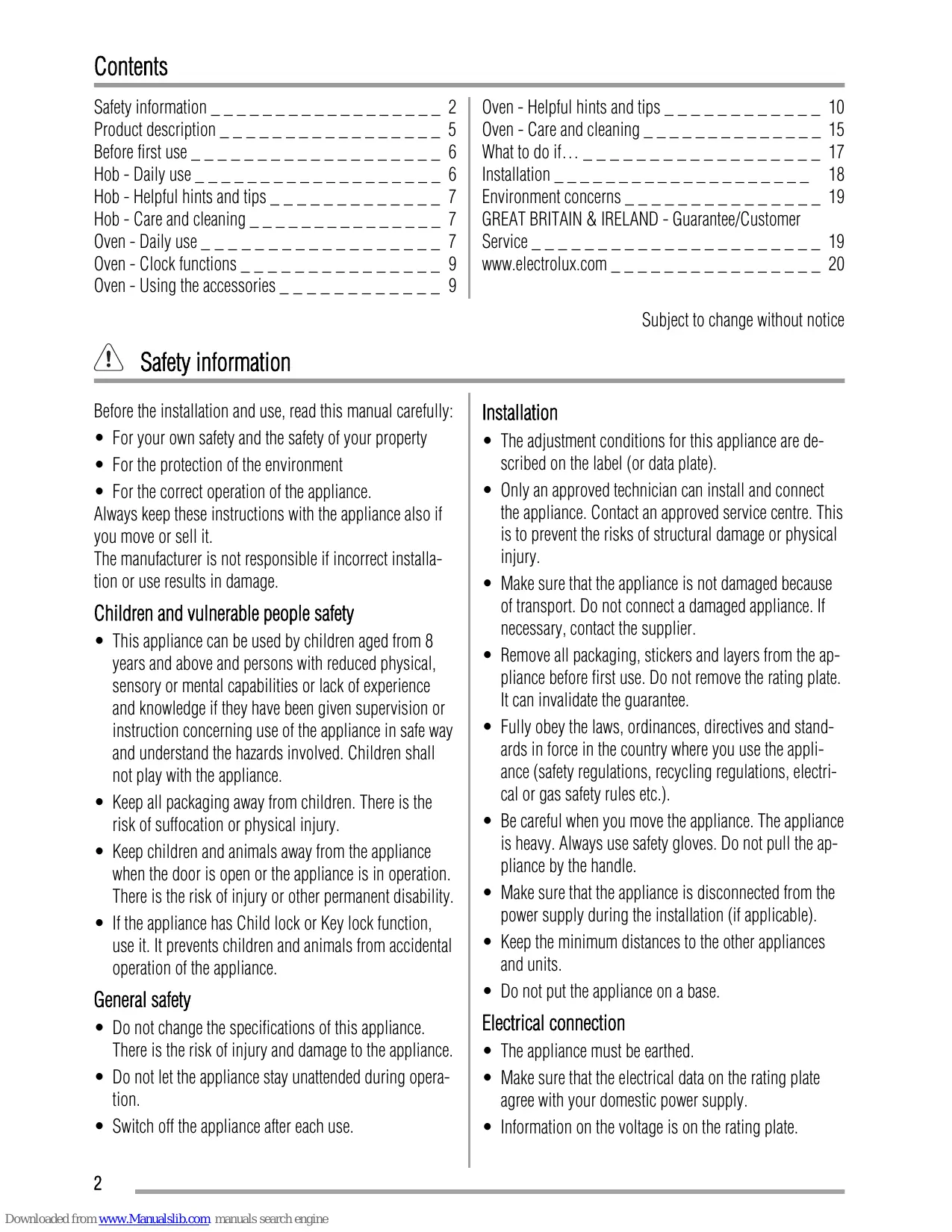your local council, your household waste disposal service or the shop where you purchased the product. Warning! Refer to "Safety information" chapter. Packaging material The packaging material is environmentally-friendly and recyclable. Plastic parts are marked with international abbreviations such as PE, PS, etc. Dispose of the packaging material in the containers provided for this purpose at your local waste management facility. GREAT BRITAIN & IRELAND - Guarantee/Customer Service Standard guarantee conditions: We, Electrolux, undertake that if within 12 months of the date of the purchase this Electrolux appliance or any part thereof is proved to be defective by reason only of faulty workmanship or materials, we will, at our option repair or replace the same FREE OF CHARGE for labour, materials or carriage on condition that: