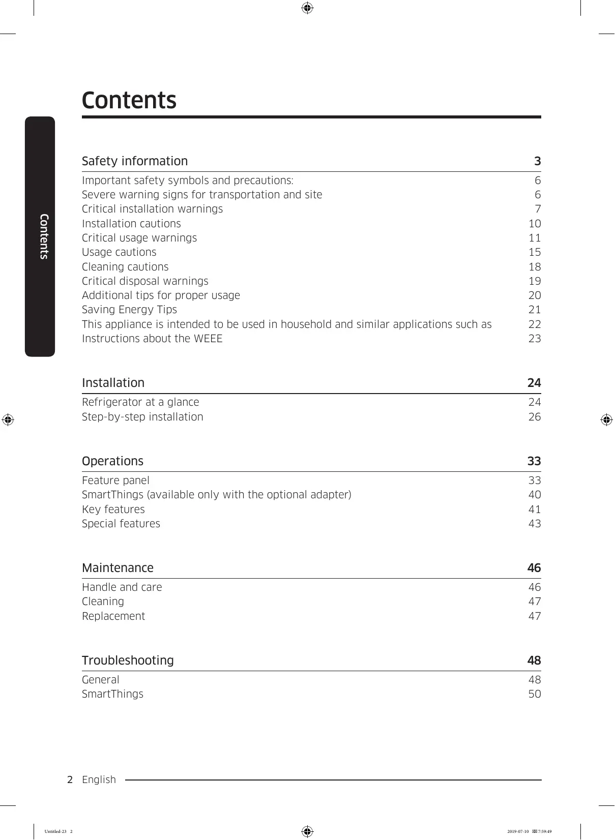 - Because these following operating instructions cover various models, the characteristics of your refrigerator may differ slightly from those described in this manual and not all warning signs may be applicable. If you have any questions or concerns, contact your nearest service center or find help and information online at www. samsung.com. English 3 Untitled-23 3 2019-07-10 7:59:49 Safety information Safety information