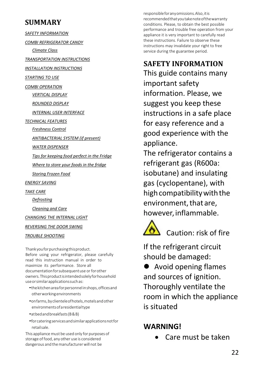 TROUBLE SHOOTING Thank you for purchasing this product. Before using your refrigerator, please carefully read this instruction manual in order to maximize its performance. Store all documentation for subsequent use or for other owners. This product is intended solely for household use or similar applications such as: - the kitchen area for personnel in shops, offices and other working environments - on farms, by clientele of hotels, motels and other environments of a residential type - at bed and breakfasts (B & B) - for catering services and similar applications not for retail sale. This appliance must be used only for purposes of storage of food, any other use is considered dangerous and the manufacturer will not be Caution: risk of fire If the refrigerant circuit should be damaged: Avoid opening flames and sources of ignition. Thoroughly ventilate the room in which the appliance is situated Percentage running WARNING! Care must be taken
