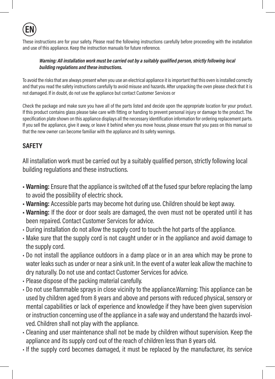 To avoid the risks that are always present when you use an electrical appliance it is important that this appliance is installed correctly and that you read the safety instructions carefully to avoid misuse and hazards. Please keep this instruction booklet for future reference and pass it on to any future owners. After unpacking the appliance please check that it is not damaged. If in doubt, do not use the appliance but contact Customer Services. The manufacturer declines all liability for damage caused to persons and objects due to incorrect or improper installation of the appliance. Any permanent electrical installation must comply with the latest wiring regulations applicable to your country and for your own safety a qualified electrician or contractor should undertake the electrical installation. Installation
