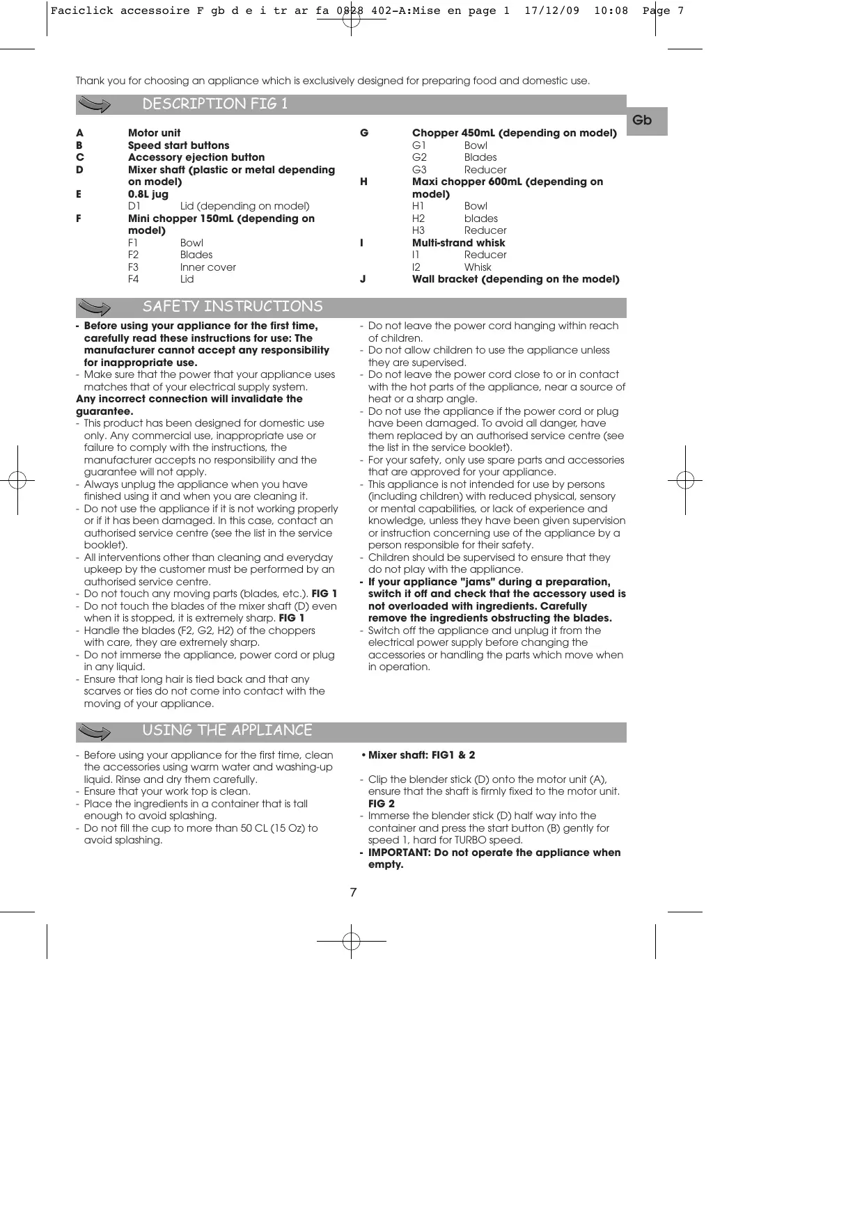 Chopper 450mL (depending on model) Bowl Blades Reducer Maxi chopper 600mL (depending on model) Bowl blades Reducer Multi-strand whisk Reducer Whisk Wall bracket (depending on the model) SAFETY INSTRUCTIONS - Before using your appliance for the first time, carefully read these instructions for use: The manufacturer cannot accept any responsibility for inappropriate use. - Make sure that the power that your appliance uses matches that of your electrical supply system. Any incorrect connection will invalidate the guarantee. - This product has been designed for domestic use only. Any commercial use, inappropriate use or failure to comply with the instructions, the manufacturer accepts no responsibility and the guarantee will not apply. - Always unplug the appliance when you have finished using it and when you are cleaning it. - Do not use the appliance if it is not working properly or if it has been damaged. In this case, contact an authorised service centre (see the list in the service booklet). - All interventions other than cleaning and everyday upkeep by the customer must be performed by an authorised service centre. - Do not touch any moving parts (blades, etc.). FIG 1 - Do not touch the blades of the mixer shaft (D) even when it is stopped, it is extremely sharp. FIG 1 - Handle the blades (F2, G2, H2) of the choppers with care, they are extremely sharp. - Do not immerse the appliance, power cord or plug in any liquid. - Ensure that long hair is tied back and that any scarves or ties do not come into contact with the moving of your appliance. - Do not leave the power cord hanging within reach of children. - Do not allow children to use the appliance unless they are supervised. - Do not leave the power cord close to or in contact with the hot parts of the appliance, near a source of heat or a sharp angle. - Do not use the appliance if the power cord or plug have been damaged. To avoid all danger, have them replaced by an authorised service centre (see the list in the service booklet). - For your safety, only use spare parts and accessories that are approved for your appliance. - This appliance is not intended for use by persons (including children) with reduced physical, sensory or mental capabilities, or lack of experience and knowledge, unless they have been given supervision or instruction concerning use of the appliance by a person responsible for their safety. - Children should be supervised to ensure that they do not play with the appliance. - If your appliance "jams" during a preparation, switch it off and check that the accessory used is not overloaded with ingredients. Carefully remove the ingredients obstructing the blades. - Switch off the appliance and unplug it from the electrical power supply before changing the accessories or handling the parts which move when in operation.