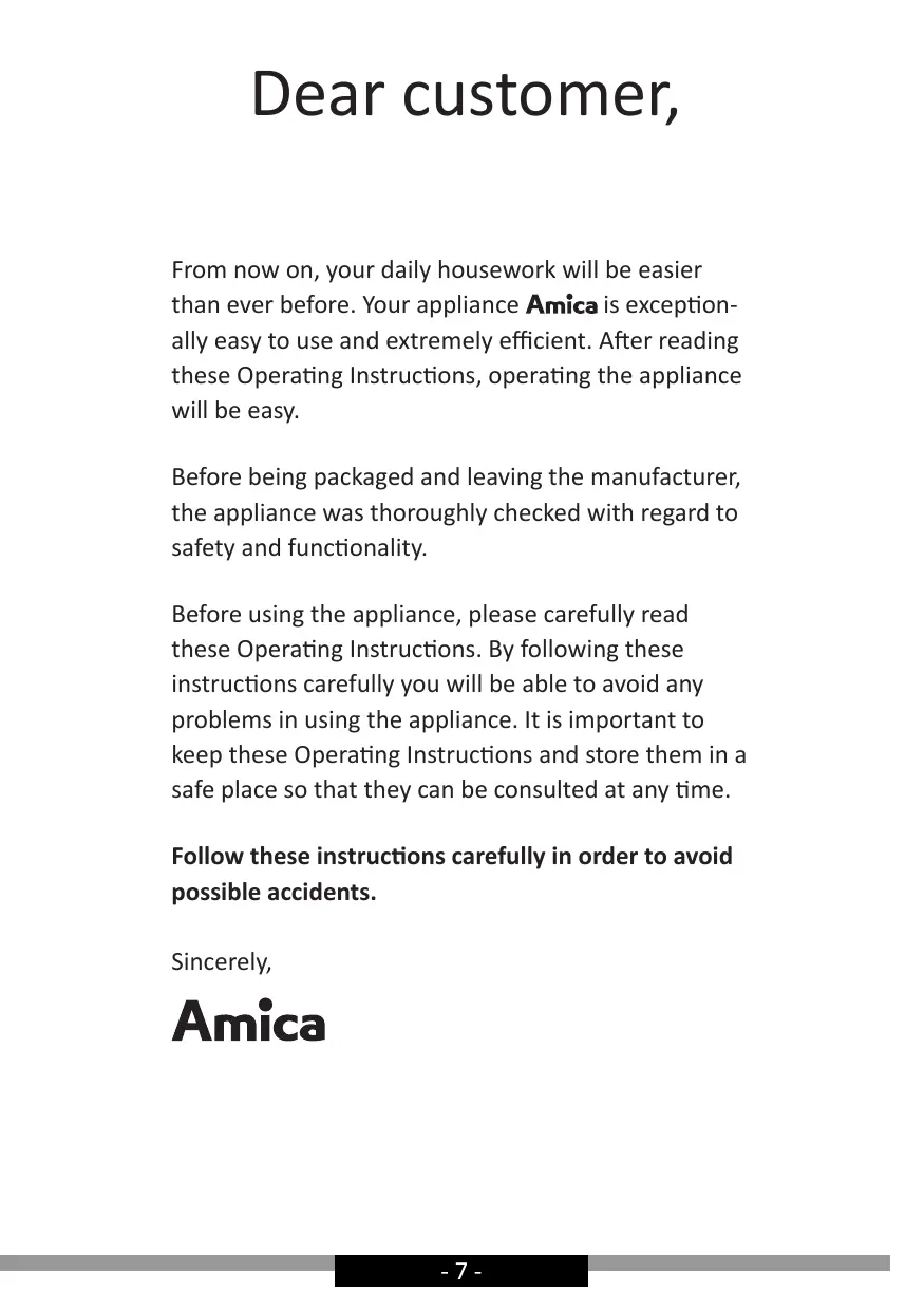 Dear customer, From now on, your daily housework will be easier than ever before. Your appliance is exceptionally easy to use and extremely efficient. After reading these Operating Instructions, operating the appliance will be easy. Before being packaged and leaving the manufacturer, the appliance was thoroughly checked with regard to safety and functionality. Before using the appliance, please carefully read these Operating Instructions. By following these instructions carefully you will be able to avoid any problems in using the appliance. It is important to keep these Operating Instructions and store them in a safe place so that they can be consulted at any time. Follow these instructions carefully in order to avoid possible accidents. Sincerely,