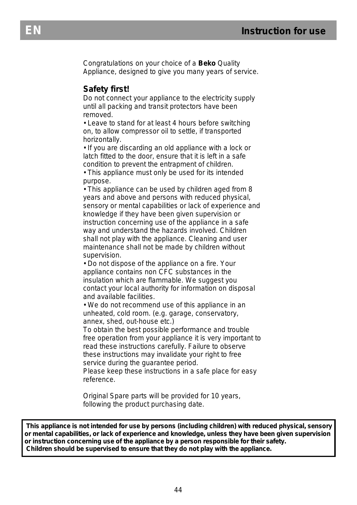 - We do not recommend use of this appliance in an unheated, cold room. (e.g. garage, conservatory, annex, shed, out-house etc.) To obtain the best possible performance and trouble free operation from your appliance it is very important to read these instructions carefully. Failure to observe these instructions may invalidate your right to free service during the guarantee period. Please keep these instructions in a safe place for easy reference. Original Spare parts will be provided for 10 years, following the product purchasing date. This appliance is not intended for use by persons (including children) with reduced physical, sensory or mental capabilities, or lack of experience and knowledge, unless they have been given supervision or instruction concerning use of the appliance by a person responsible for their safety. Children should be supervised to ensure that they do not play with the appliance.