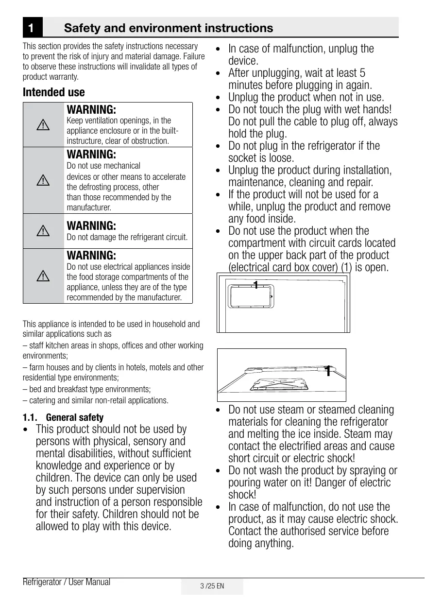 If the product will not be used for a while, unplug the product and remove any food inside. - Do not use the product when the compartment with circuit cards located on the upper back part of the product (electrical card box cover) (1) is open.