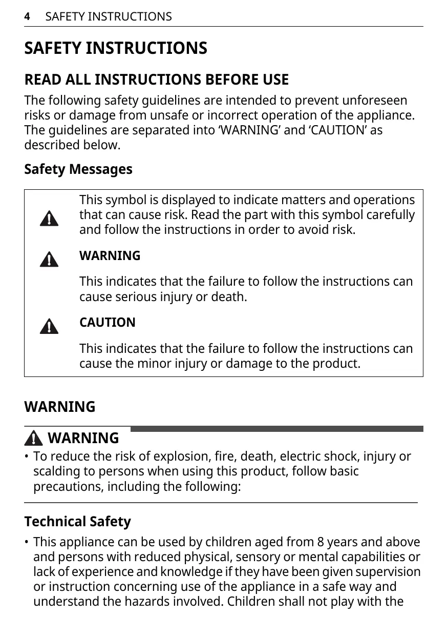 - This appliance can be used by children aged from 8 years and above and persons with reduced physical, sensory or mental capabilities or lack of experience and knowledge if they have been given supervision or instruction concerning use of the appliance in a safe way and understand the hazards involved. Children shall not play with the