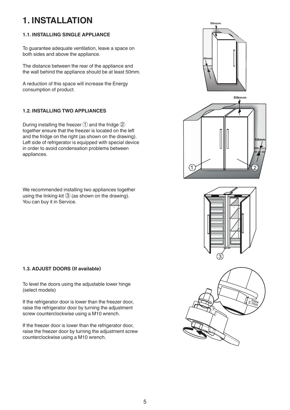 1.2. INSTALLING TWO APPLIANCES During installing the freezer 1 and the fridge 2 together ensure that the freezer is located on the left and the fridge on the right (as shown on the drawing).