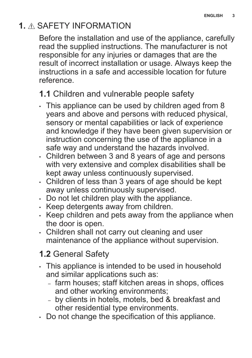 This appliance can be used by children aged from 8 years and above and persons with reduced physical, sensory or mental capabilities or lack of experience and knowledge if they have been given supervision or instruction concerning the use of the appliance in a safe way and understand the hazards involved. Children between 3 and 8 years of age and persons with very extensive and complex disabilities shall be kept away unless continuously supervised. Children of less than 3 years of age should be kept away unless continuously supervised. Do not let children play with the appliance. Keep detergents away from children. Keep children and pets away from the appliance when the door is open. Children shall not carry out cleaning and user maintenance of the appliance without supervision.