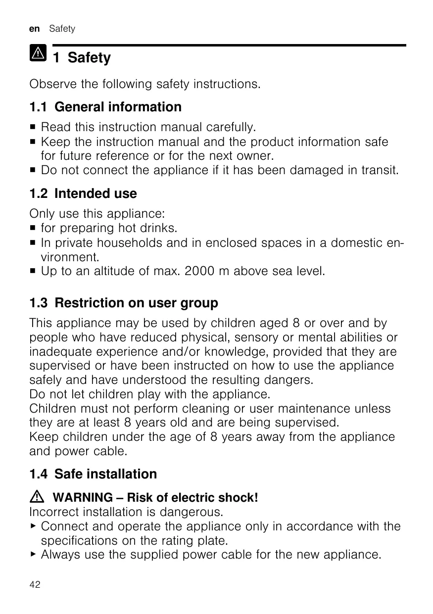 Only use this appliance: ¡ for preparing hot drinks. ¡ In private households and in enclosed spaces in a domestic environment. ¡ Up to an altitude of max. 2000 m above sea level.