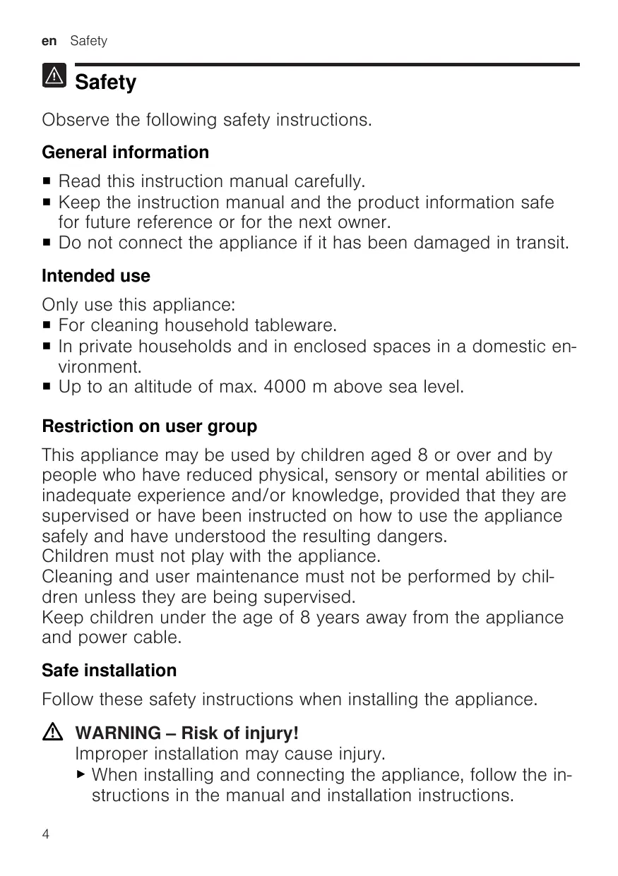 en Safety Safety Observe the following safety instructions. General information ¡ Read this instruction manual carefully. ¡ Keep the instruction manual and the product information safe for future reference or for the next owner. ¡ Do not connect the appliance if it has been damaged in transit. Intended use Only use this appliance: ¡ For cleaning household tableware. ¡ In private households and in enclosed spaces in a domestic environment. ¡ Up to an altitude of max. 4000 m above sea level. Restriction on user group This appliance may be used by children aged 8 or over and by people who have reduced physical, sensory or mental abilities or inadequate experience and/or knowledge, provided that they are supervised or have been instructed on how to use the appliance safely and have understood the resulting dangers. Children must not play with the appliance. Cleaning and user maintenance must not be performed by children unless they are being supervised. Keep children under the age of 8 years away from the appliance and power cable. Safe installation Follow these safety instructions when installing the appliance. WARNING ‒ Risk of injury! Improper installation may cause injury. ▶ When installing and connecting the appliance, follow the instructions in the manual and installation instructions.