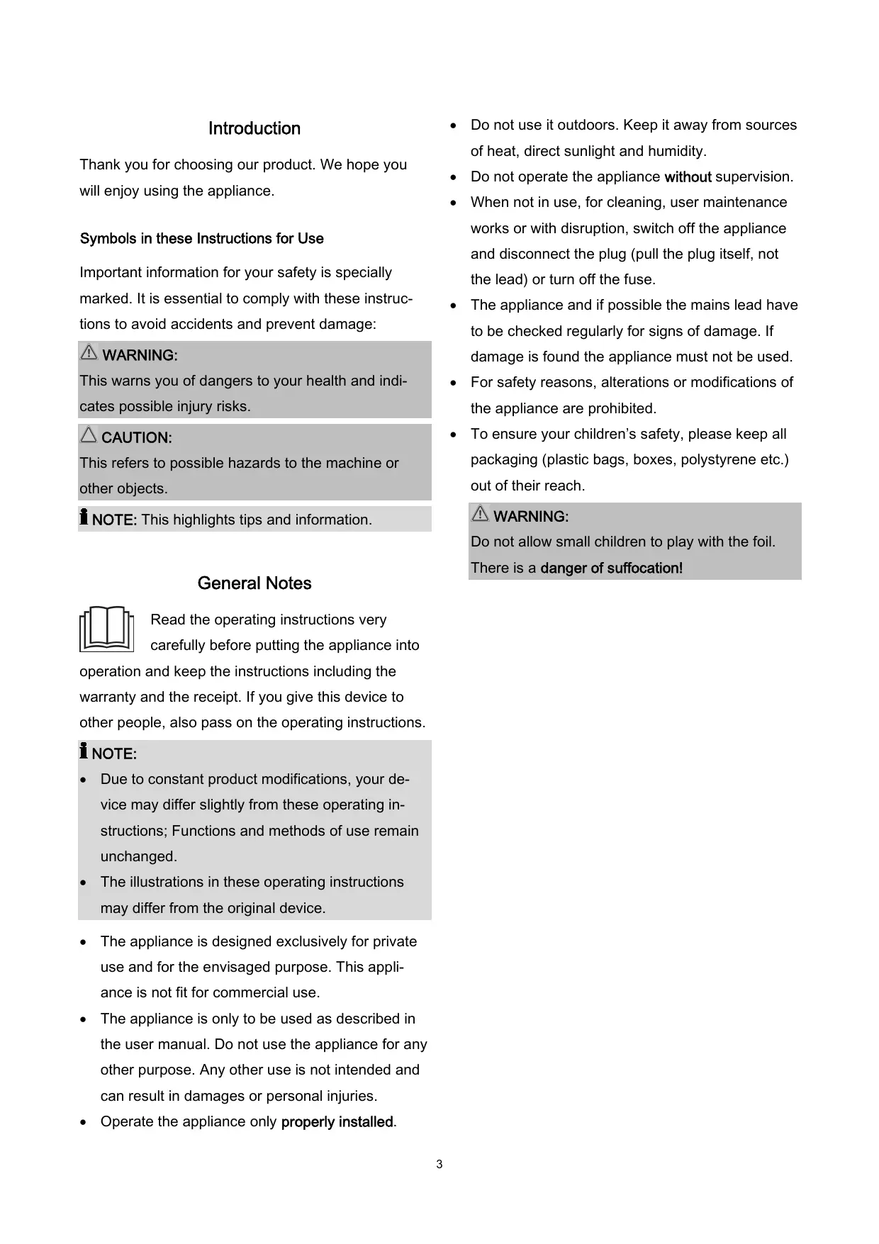 NOTE: This highlights tips and information. Do not allow small children to play with the foil. There is a danger of suffocation! General Notes Read the operating instructions very carefully before putting the appliance into operation and keep the instructions including the warranty and the receipt. If you give this device to other people, also pass on the operating instructions. NOTE: Due to constant product modifications, your device may differ slightly from these operating instructions; Functions and methods of use remain unchanged. The illustrations in these operating instructions may differ from the original device. The appliance is designed exclusively for private use and for the envisaged purpose. This appliance is not fit for commercial use. The appliance is only to be used as described in the user manual. Do not use the appliance for any other purpose. Any other use is not intended and can result in damages or personal injuries. Operate the appliance only properly installed.