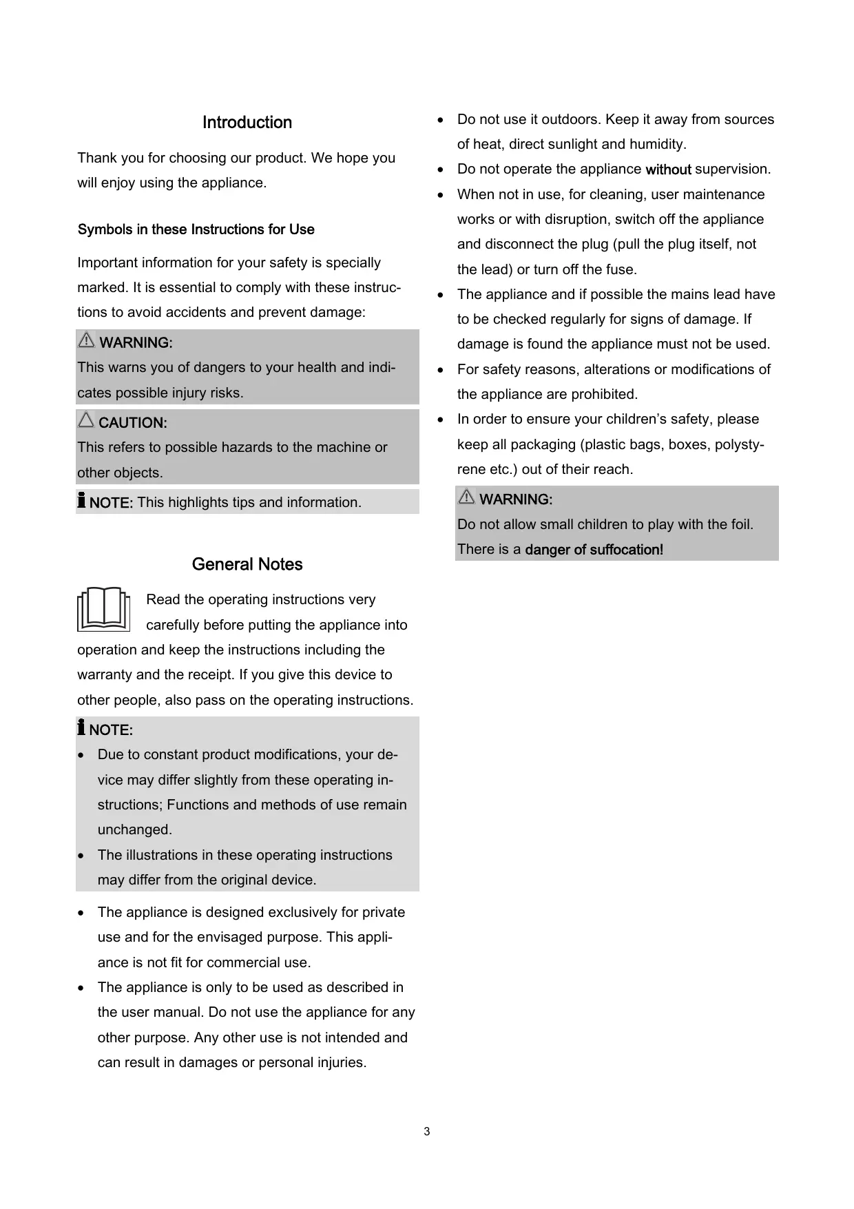 Introduction Thank you for choosing our product. We hope you Will enjoy using the appliance. Symbols in these Instructions for Use Important information for your safety is specially marked. It is essential to comply with these instruc- tions to avoid accidents and prevent damage: À WARNING: This warns you of dangers to your health and indi- cates possible injury risks. À CAUTION: This refers to possible hazards to the machine or other objects. i NOTE: This highlights tips and information. General Notes Read the operating instructions very carefully before putting the appliance into operation and keep the instructions including the warranty and the receipt. If you give this device to other people, also pass on the operating instructions. Ê NOTE: + Due to constant product modifications, your de- vice may differ slightly from these operating in- structions; Functions and methods of use remain unchanged. + Theillustrations in these operating instructions may differ from the original device. + The appliance is designed exclusively for private use and for the envisaged purpose. This appli- ance is not fit for commercial use. + The appliance is only to be used as described in the user manual. Do not use the appliance for any other purpose. Any other use is not intended and can result in damages or personal injuries. Do not use it outdoors. Keep it away from sources of heat, direct sunlight and humidity. Do not operate the appliance without supervision. When not in use, for cleaning, user maintenance works or with disruption, switch off the appliance and disconnect the plug (pull the plug itself, not the lead) or turn off the fuse. The appliance and if possible the mains lead have to be checked regularly for signs of damage. If damage is found the appliance must not be used. For safety reasons, alterations or modifications of the appliance are prohibited. In order to ensure your children's safety, please keep all packaging (plastic bags, boxes, polysty- rene etc.) out of their reach. À WARNING: Do not allow small children to play with the foil. There is a danger of suffocation!