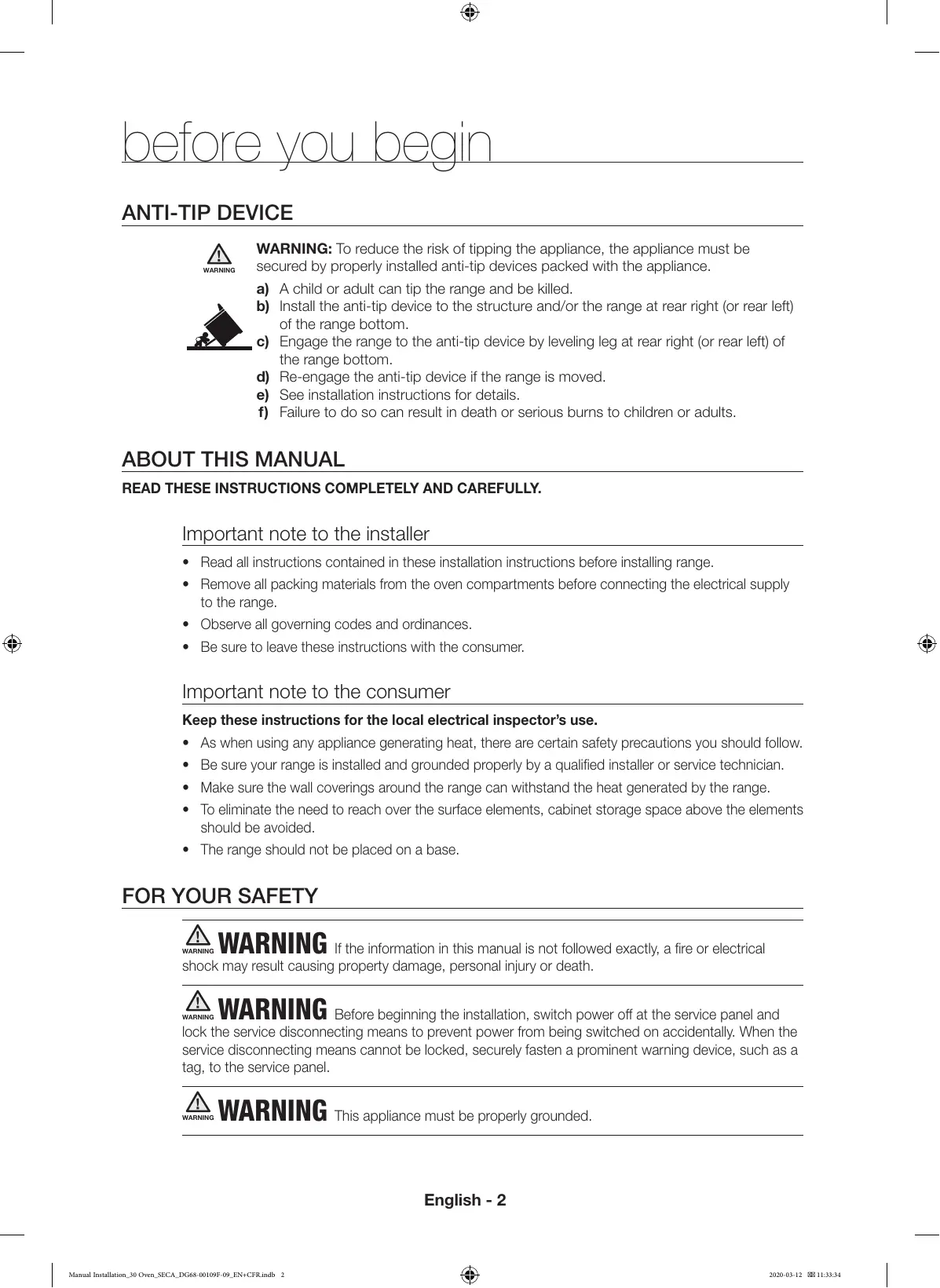 WARNING If the information in this manual is not followed exactly, a fire or electrical shock may result causing property damage, personal injury or death. WARNING WARNING Before beginning the installation, switch power off at the service panel and lock the service disconnecting means to prevent power from being switched on accidentally. When the service disconnecting means cannot be locked, securely fasten a prominent warning device, such as a tag, to the service panel. WARNING WARNING WARNING This appliance must be properly grounded. English - 2 Manual Installation_30 Oven_SECA_DG68-00109F-09_EN+CFR.indb 2 2020-03-12 11:33:34 preparing to install the range REMOVE PACKAGING Remove packaging materials. Failure to remove packaging materials could result in damage to the appliance. 01 BEFORE YOU BEGIN & PREPARING TO INSTALL THE RANGE