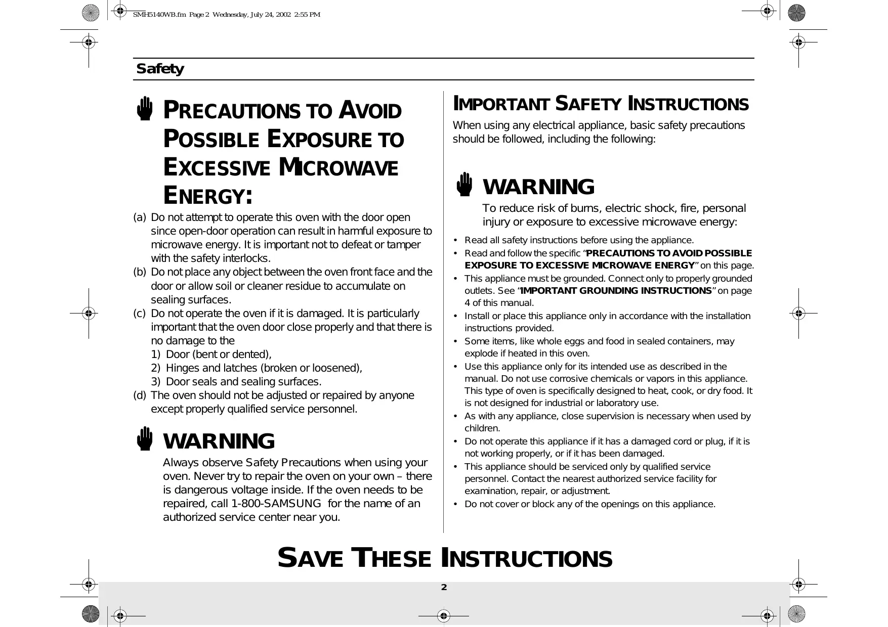 Code No. : DE68-00356B SMH5140WB.fm Page 2 Wednesday, July 24, 2002 2:55 PM Safety